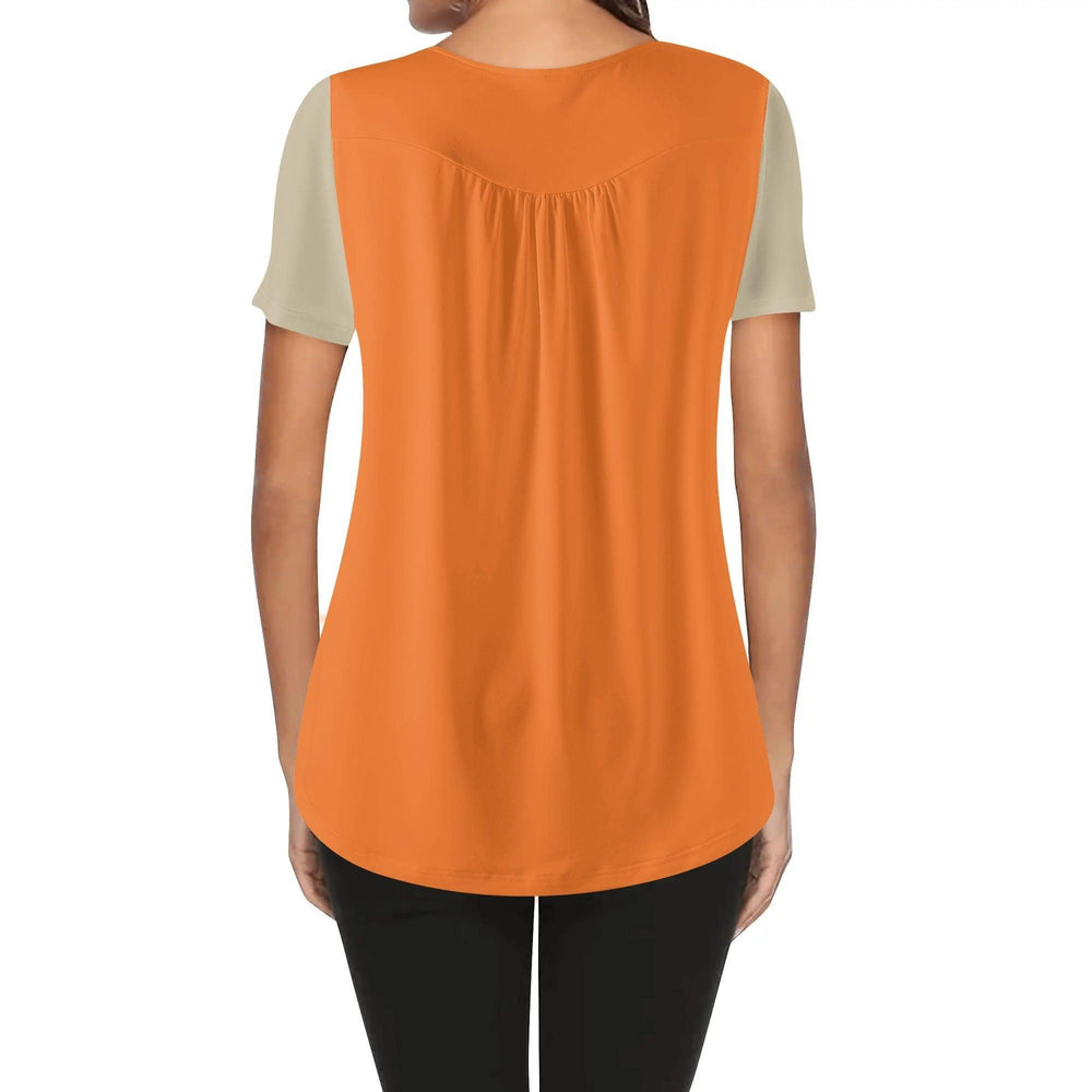 シックで快適なツートンカラーのトップスで、カジュアルなワードローブをワンランクアップさせましょう。鮮やかなオレンジのボディと温かみのあるイエローオレンジの袖が、個性的で目を引くルックスを演出します。フロントのギャザーと繊細な3つのボタンがフェミニンな魅力を添え、流れるようなシルエットが一日中快適な着心地を提供し、様々な体型にマッチします。
