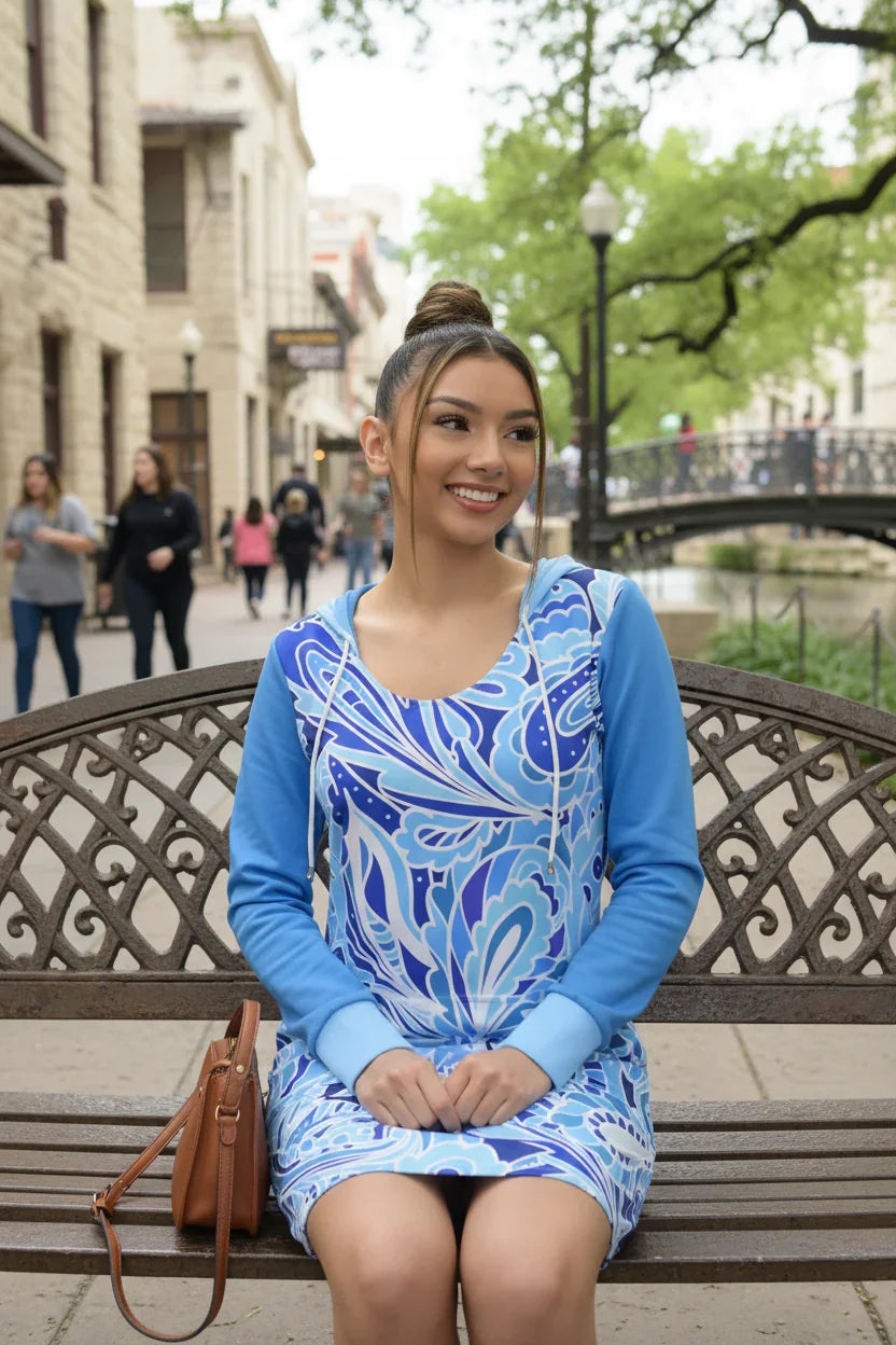 個性的で存在感のある一着をお探しなら、 Aqui フーディードレスがぴったりです。お好みの着心地の良いジャージー素材で仕立てられたこのドレスは、鮮やかなブルーの万華鏡のようなフローラルプリントが特徴で、カジュアルな集まりにも、特別な夜のデートにもぴったりです。