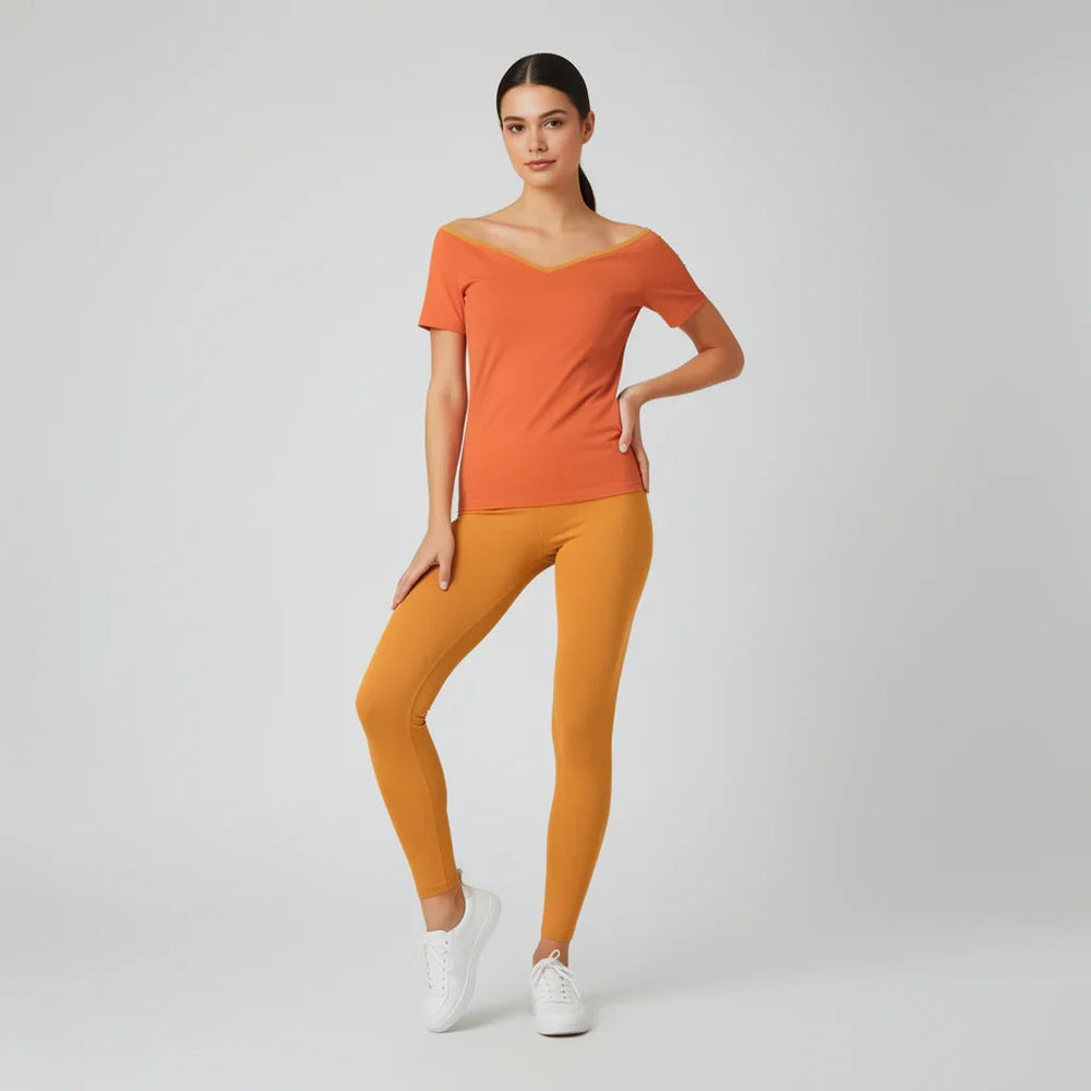 Meet the V-neck Off-Shoulder Fitted Tee from our Core Series Essentials—where an easy silhouette meets refined detail. The neckline skims the shoulders with a modern V that frames the collarbone, while gentle stretch creates a smooth, body-hugging fit without feeling restrictive. The Giant Orange hue is boldly sunlit and instantly energizing; the Tangerine trim adds a clean, tonal edge that reads both playful and polished. It’s the kind of top that looks styled, even when you’re keeping it simple.
