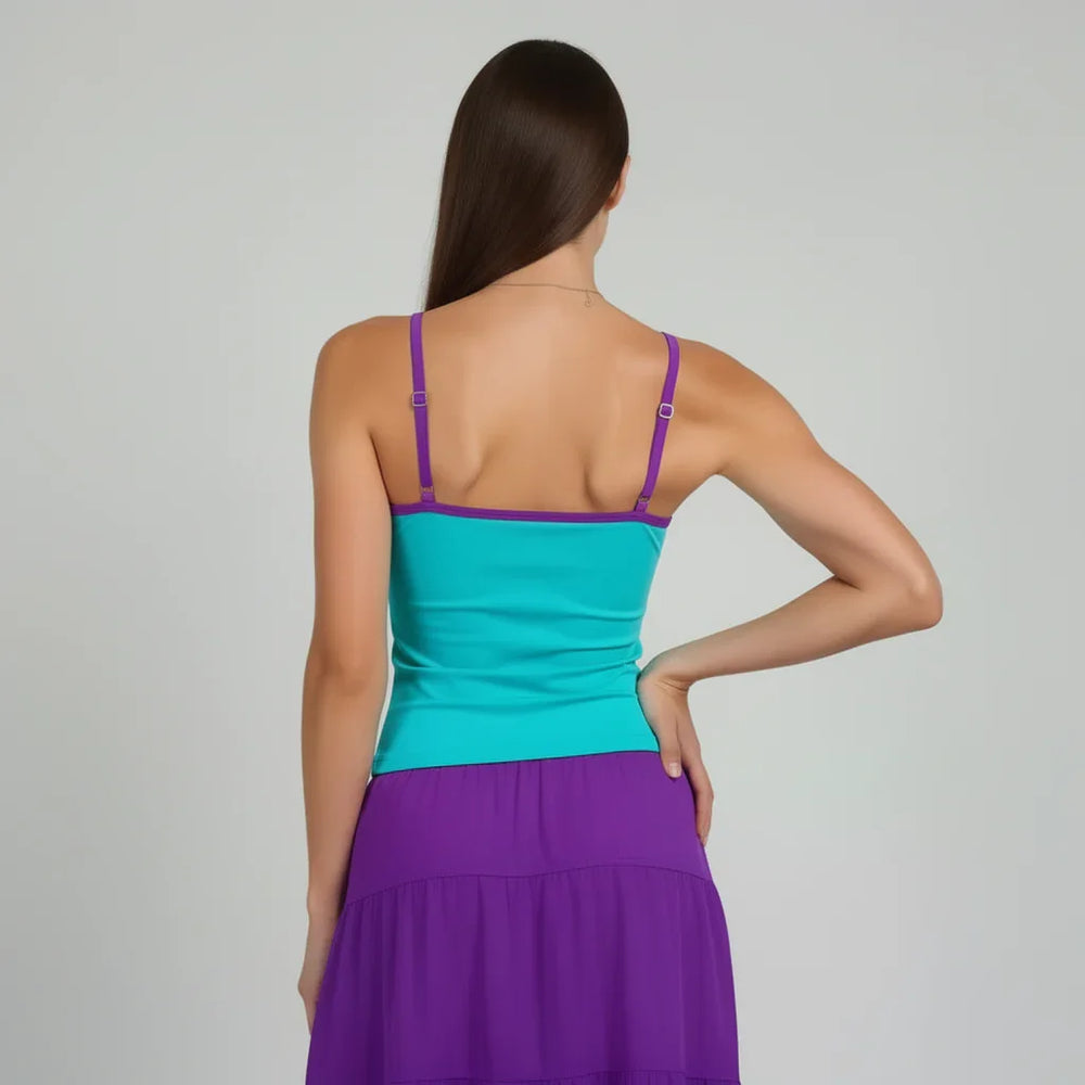 Dive into effortless chic with our Core Essentials Cami Tank Top in a captivating shade of Aqua Cyan, artfully framed by a vibrant Electric Violet trim. This isn't just a basic; it's the elevated foundation your wardrobe has been craving.