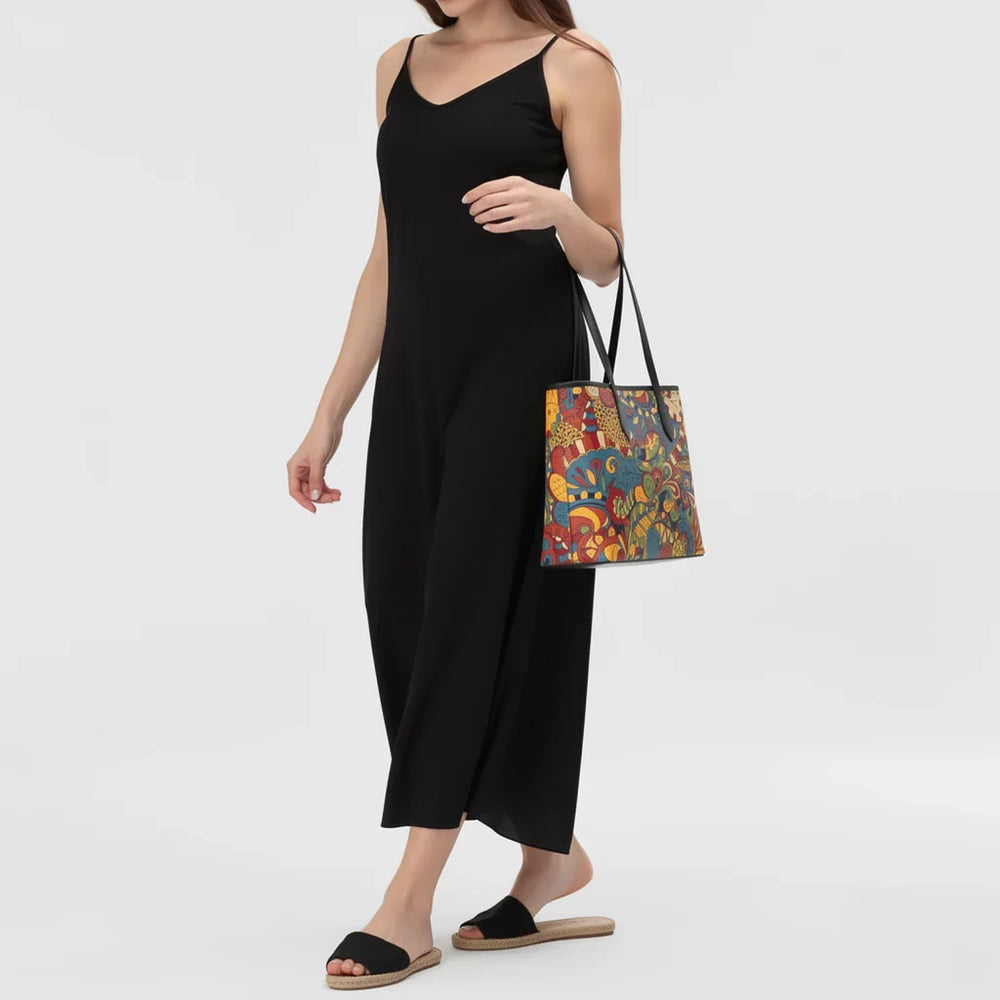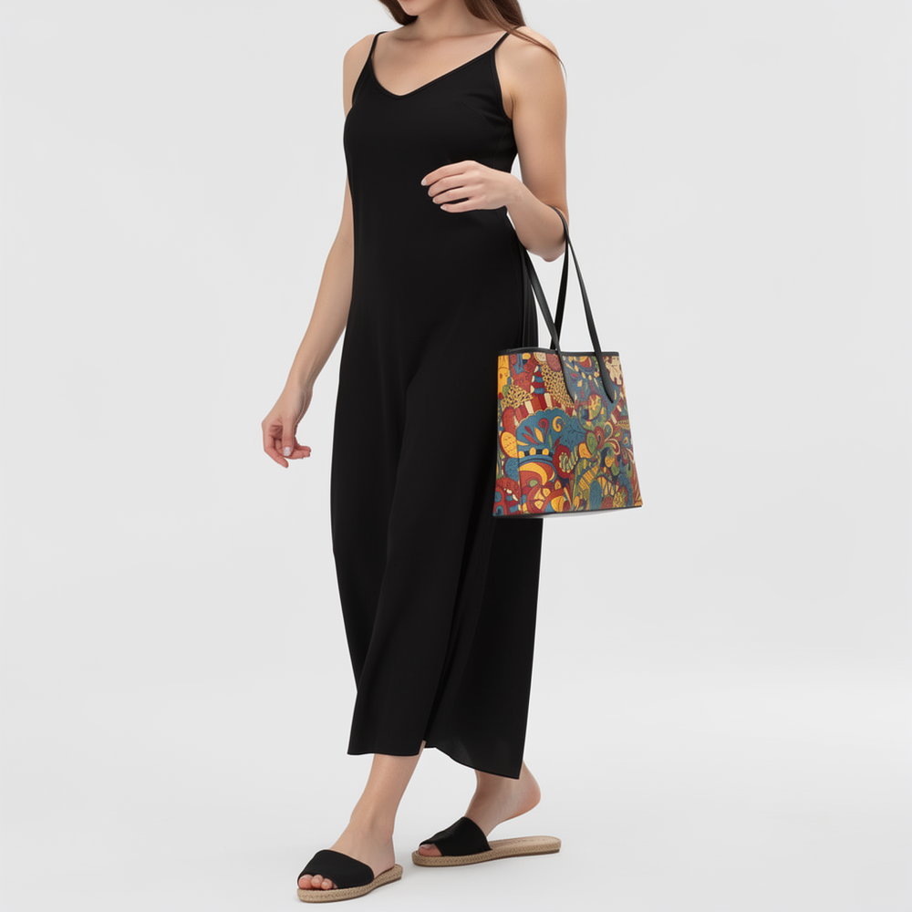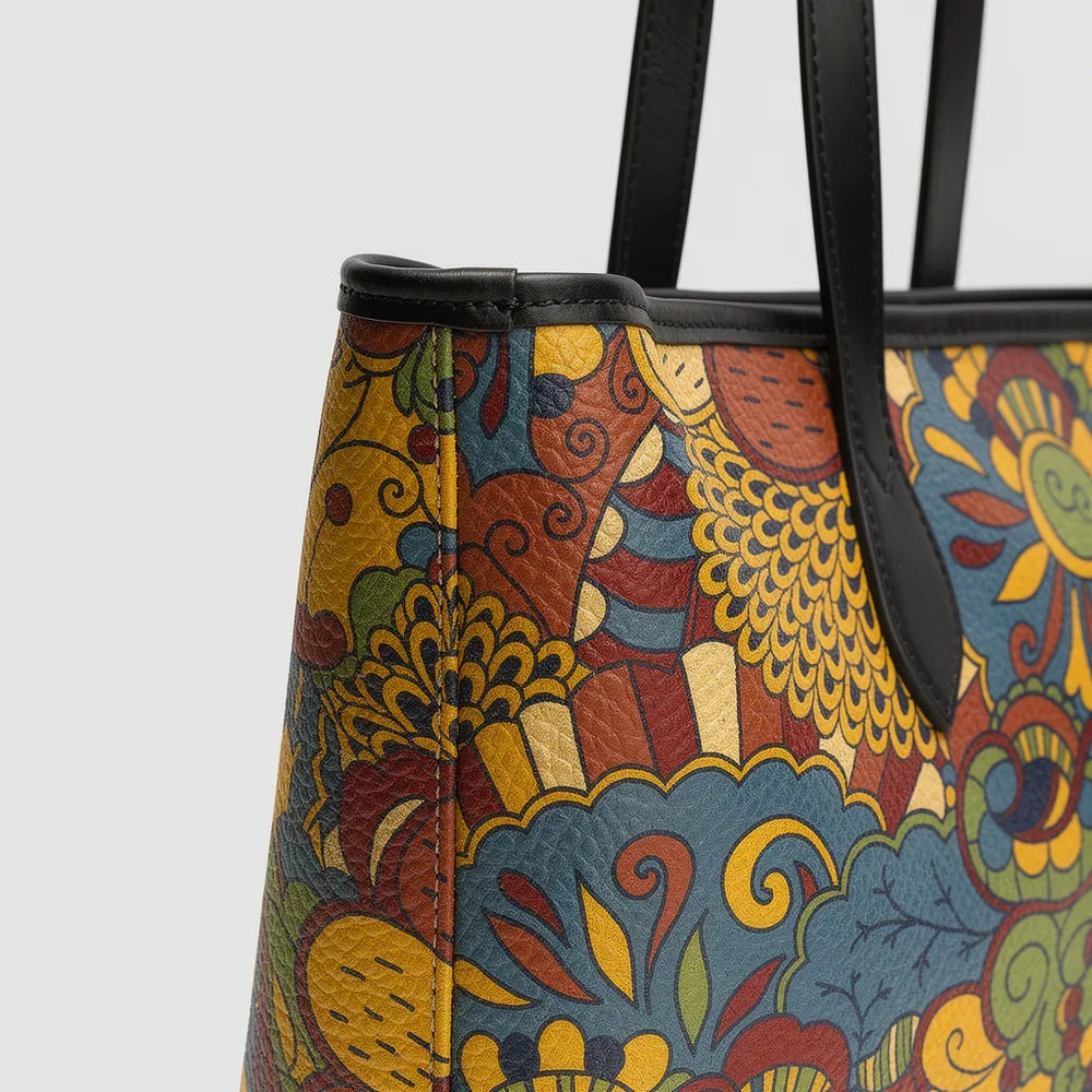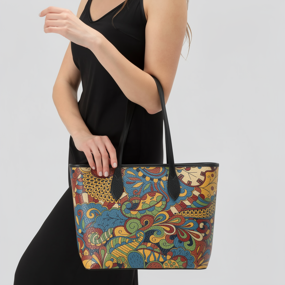 Zentangle®スタイルからインスピレーションを得た、 Ebisaパターンの見事な繊細さをご覧ください。精巧なワイルドペイズリーフローラル、ヒプノティックスワール、幾何学的な鱗、そしてサーペンタインラインが、このラグジュアリーなショッパートートバッグの中で、流れるような洗練された構成の中で優雅に調和しています。
