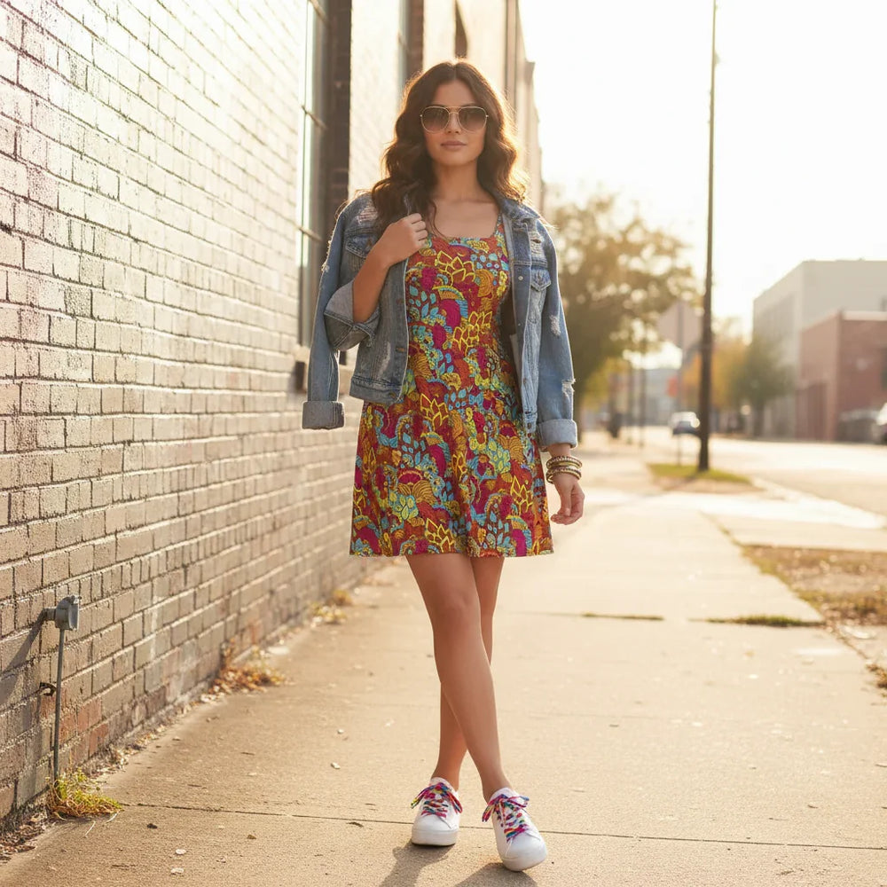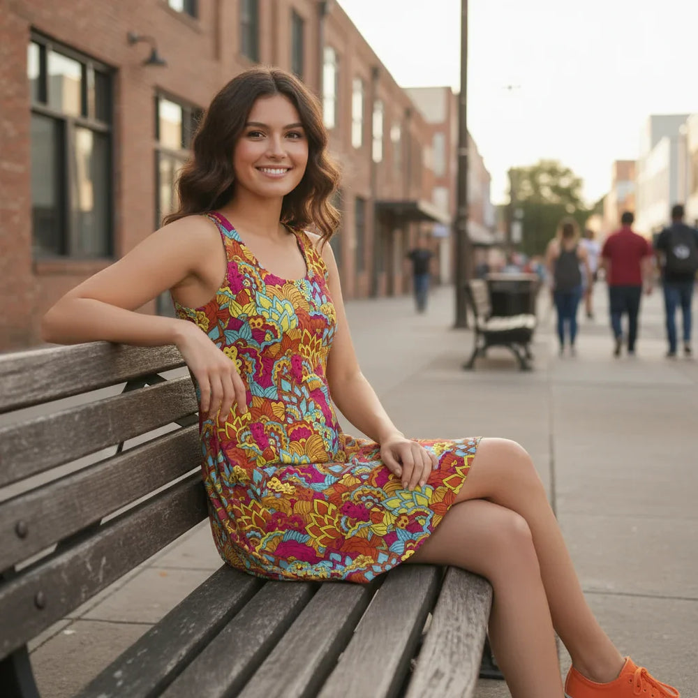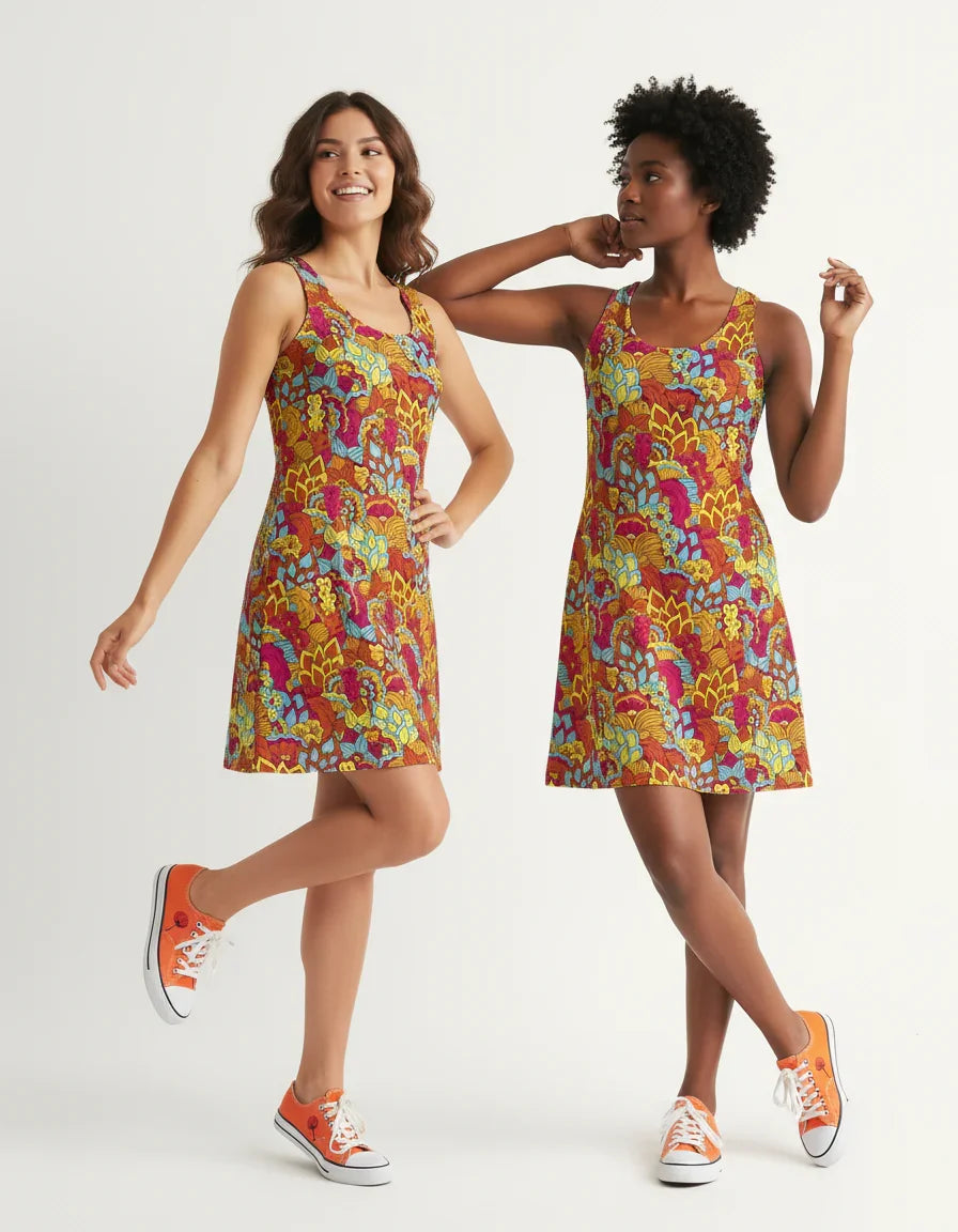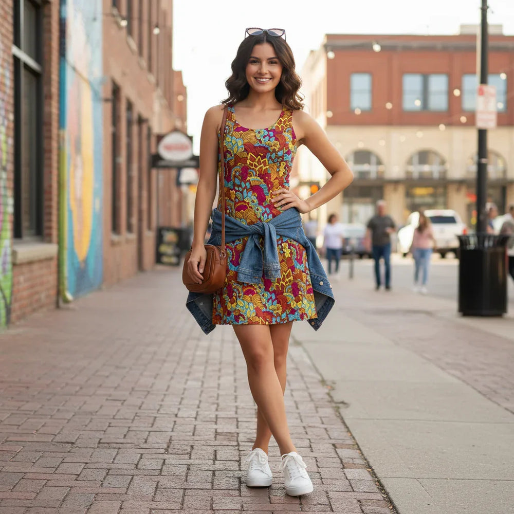 曲線美を際立たせるレーサーバックドレスは、サイケデリックでレトロなマルチカラーフローラルプリントで、きっとあなたを魅了することでしょう。大胆な新しいスタイルに挑戦して、一歩踏み出しましょう!鮮やかで目を引くミニドレスで、個性をアピールしましょう。