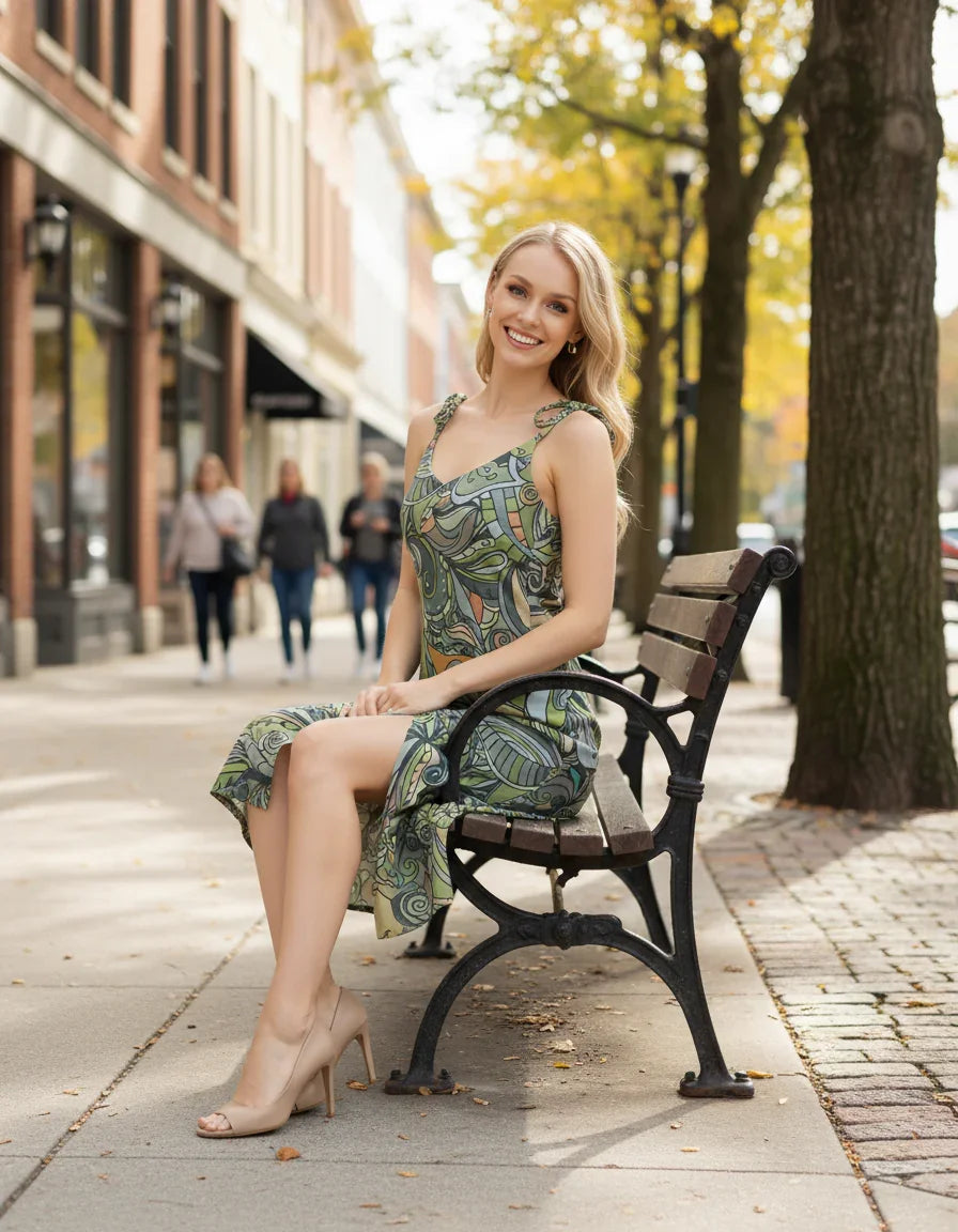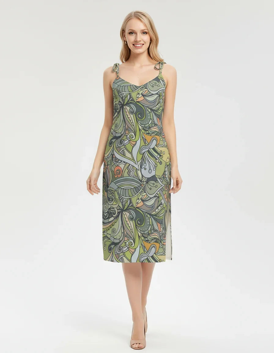 目を引く生き生きとした Jana の植物ペイズリー モチーフで飾られたこの魅力的なミディ ドレスは、昼から夜への楽々としたスタイリッシュな移行に最適です。タイ ストラップとフロント スリットにより、ワードローブに欠かせないアイテムに昇華されています。