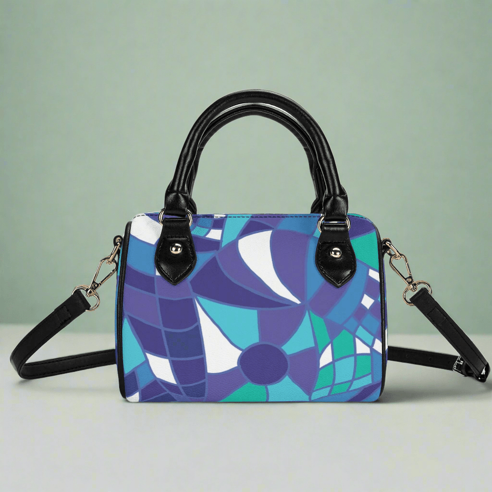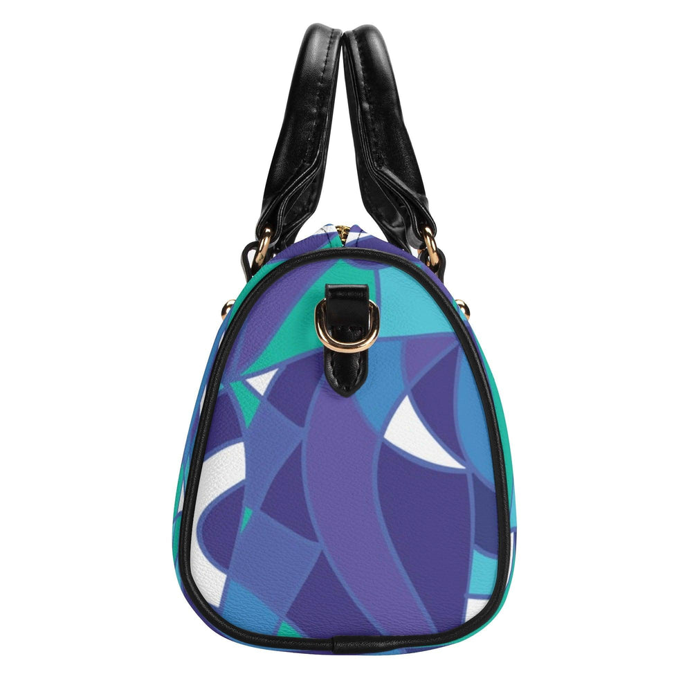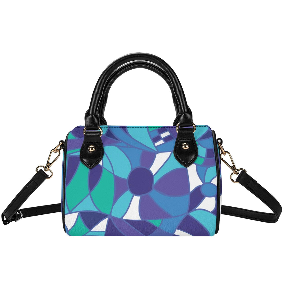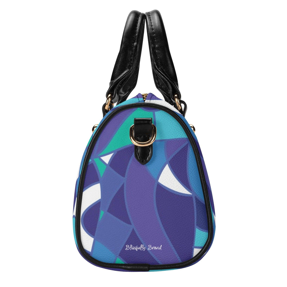 目を引くハンドバッグで、スタイルをワンランクアップさせましょう。きっと注目を集めること間違いなし!大胆で抽象的な久米幾何学模様を、魅惑的なブルー、パープル、ティールの色合いで表現したこのバッグは、まさに芸術作品と言えるでしょう。洗練されたボストン型は、ファッショナブルでありながら機能的で、必需品をスタイリッシュに持ち運ぶのに最適です。丈夫なブラックのハンドルと、調節・取り外し可能なショルダーストラップが付属し、様々な持ち方に対応します。ゴールドトーンの金具が高級感を添え、鮮やかなデザインを引き立てます。
