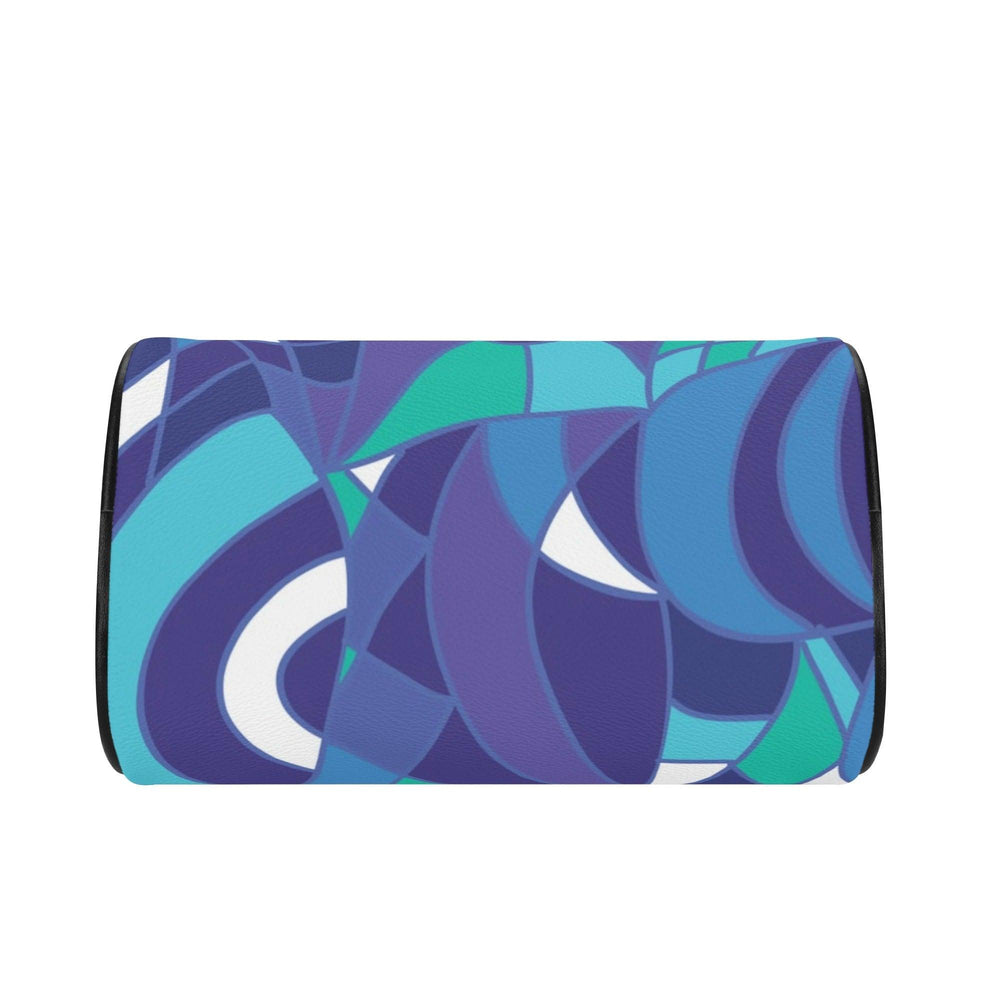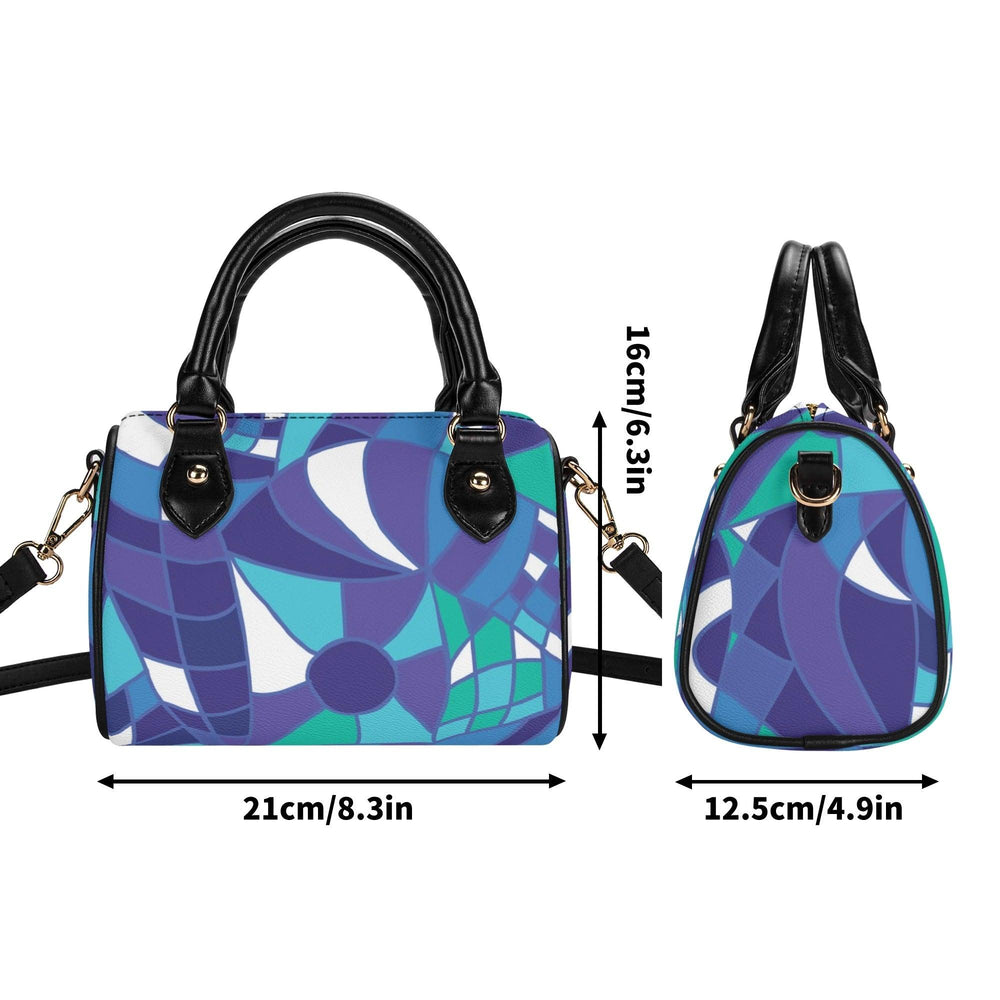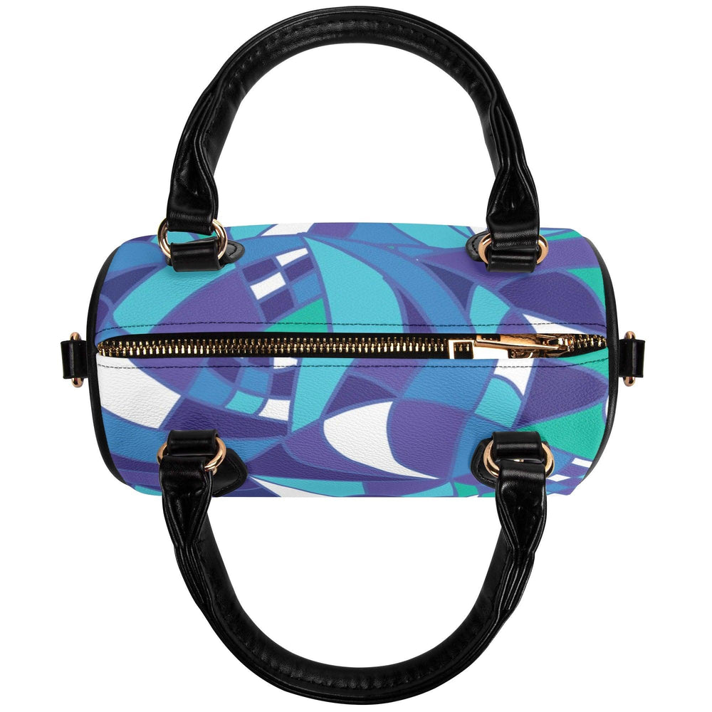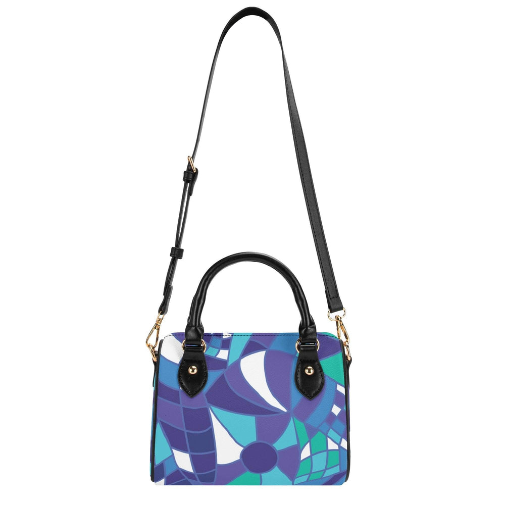目を引くハンドバッグで、スタイルをワンランクアップさせましょう。きっと注目を集めること間違いなし!大胆で抽象的な久米幾何学模様を、魅惑的なブルー、パープル、ティールの色合いで表現したこのバッグは、まさに芸術作品と言えるでしょう。洗練されたボストン型は、ファッショナブルでありながら機能的で、必需品をスタイリッシュに持ち運ぶのに最適です。丈夫なブラックのハンドルと、調節・取り外し可能なショルダーストラップが付属し、様々な持ち方に対応します。ゴールドトーンの金具が高級感を添え、鮮やかなデザインを引き立てます。