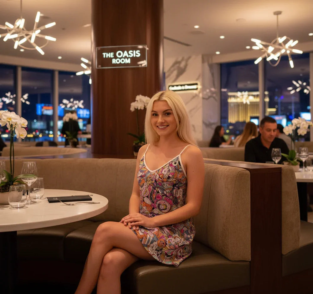 仕事着として着こなせるほど上品で、夜の街にもスタイリッシュに着こなせるこのドレスは、あっという間に最高のスタイルに。鮮やかな万華鏡プリント、上質な素材使い、そしてミニ丈。どこへ行っても注目を集めること間違いなし!