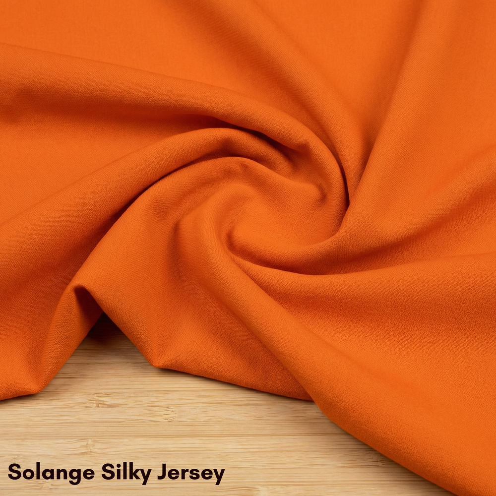 ソランジュ シルキージャージー:中厚の横編みシングルジャージーです。柔らかく弾力のある質感で、指通りも滑らかです。ソランジュ シルキージャージーの美しいドレープ感は、繊細でフェミニンなスタイリングに最適です。