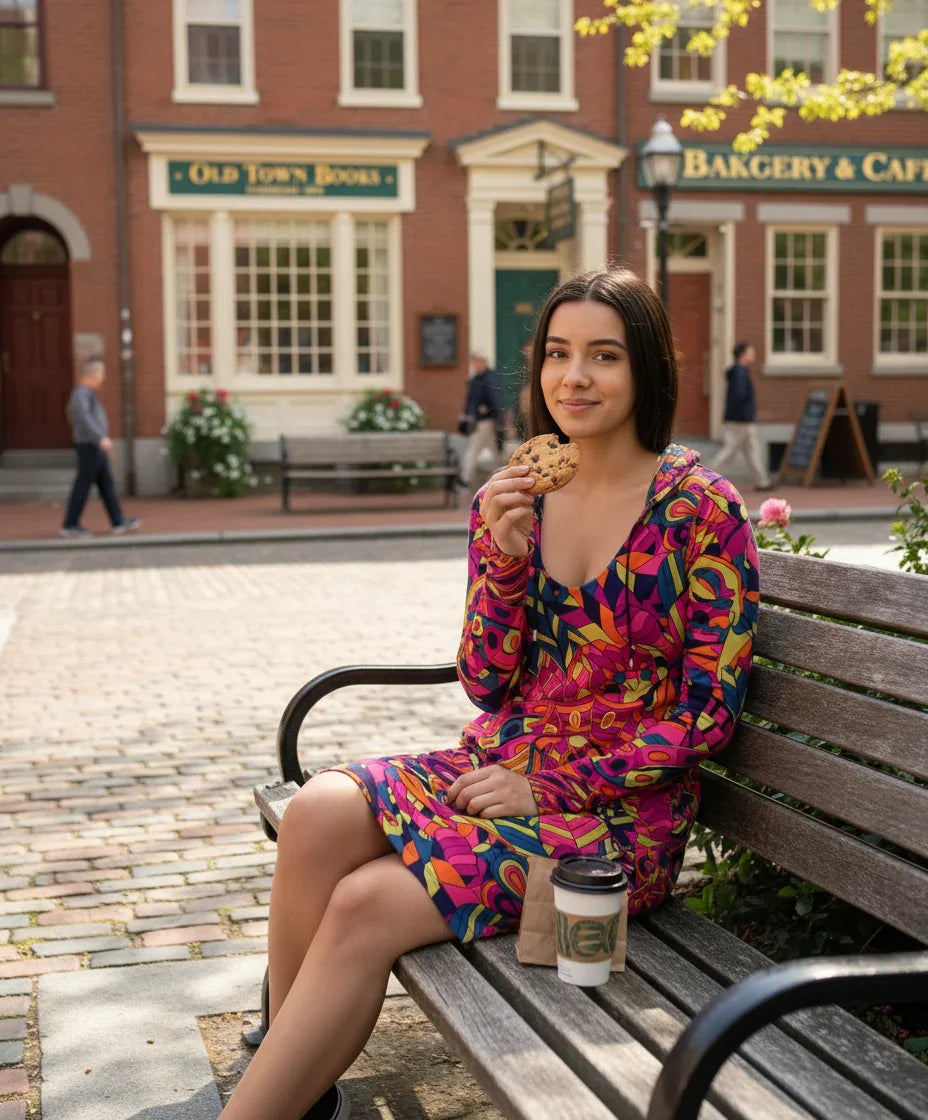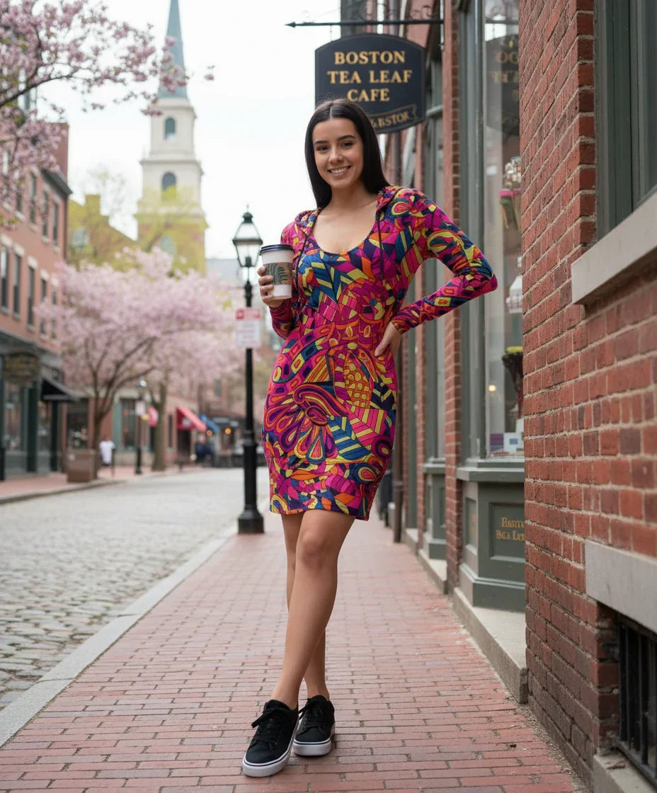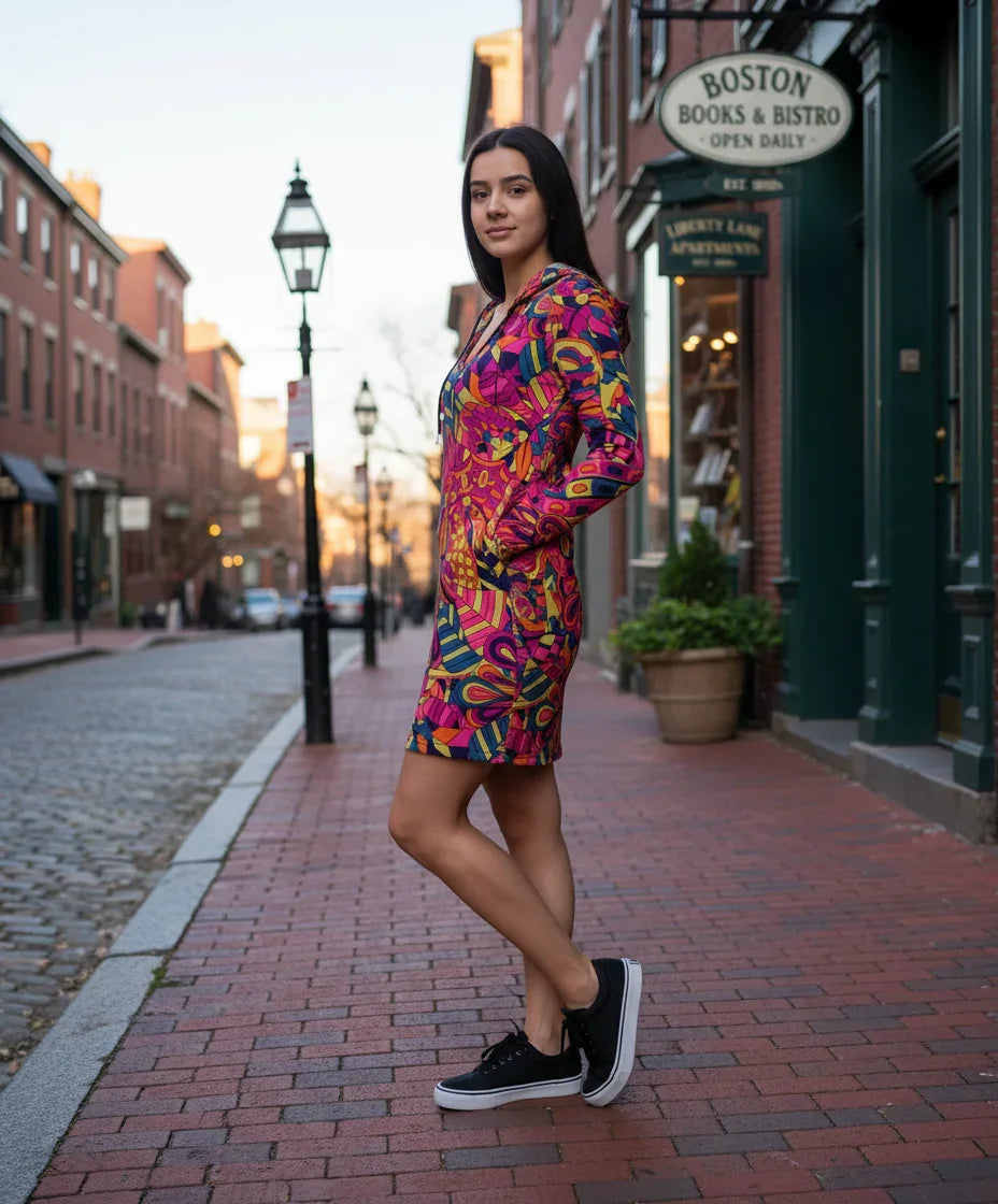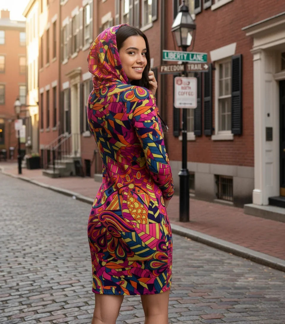 この眩いばかりのフーディードレスは、今シーズンのワードローブに欠かせないアイテムです。大胆な抽象画「Lina」柄がラグジュアリーな視線を惹きつけ、厳選された快適な生地で一日中快適にお過ごしいただけます。この素敵な一着で、周りの人を魅了しましょう!