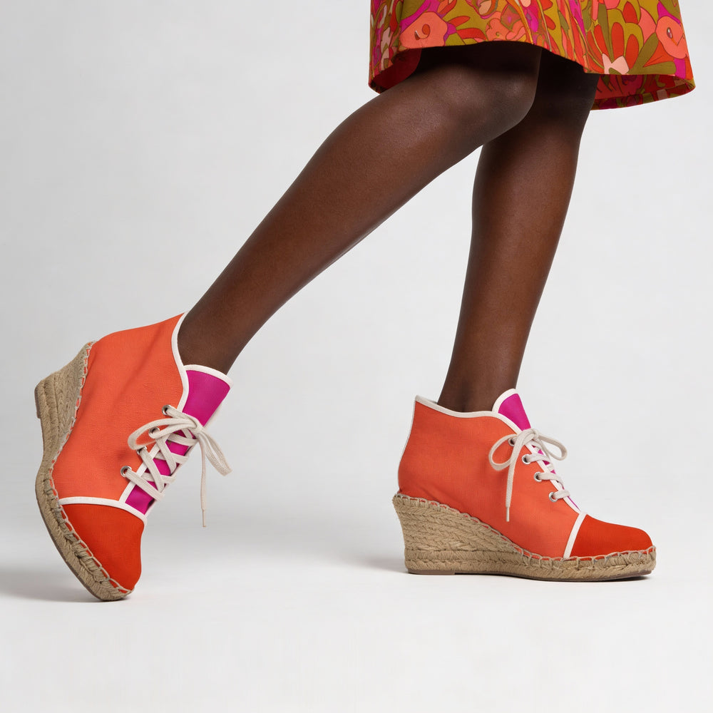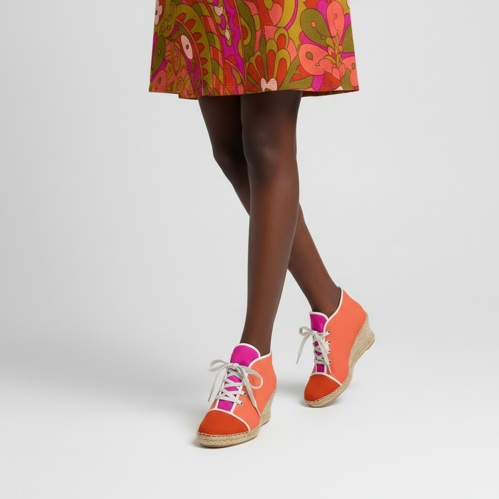 印象的なカラーブロッキングパレットで魅惑的な大胆なデザインのこのミナ エスパドリーユは、ジュート ウェッジ プラットフォームを備え、まるで雲の上で踊っているような気分にさせてくれます。
