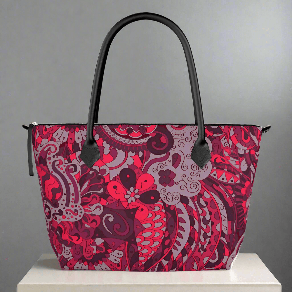 魅惑的なペナパターンをぜひご体験ください。魅惑的なサイケデリックな魅力を放ち、万華鏡のような花のモチーフのエッセンスを余すところなく表現しています。この贅沢なデザインは、精緻な要素と大胆さを完璧に融合させ、豪華さと遊び心の完璧なバランスを実現しています。この贅沢なサテントートバッグで、あらゆる瞬間をエスケープへと変え、鮮烈な印象を残しましょう。