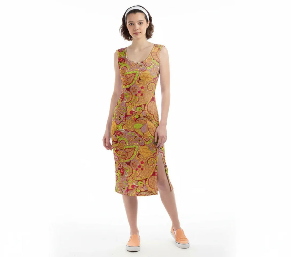 プリントパターン:鮮やかなボヘミアン、抽象的なペイズリー柄、万華鏡のような模様、サイケデリック、しなやかな線、渦巻き模様、抽象的な形、大胆なマルチカラー