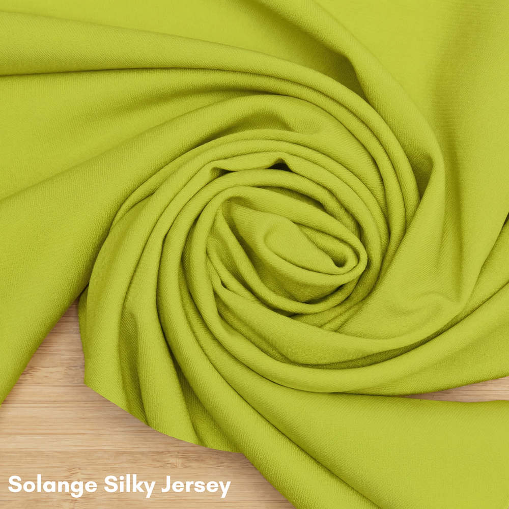 ソランジュ シルキージャージー:中厚の横編みシングルジャージーです。柔らかく弾力のある質感で、指通りも滑らかです。ソランジュ シルキージャージーの美しいドレープ感は、繊細でフェミニンなスタイリングに最適です。