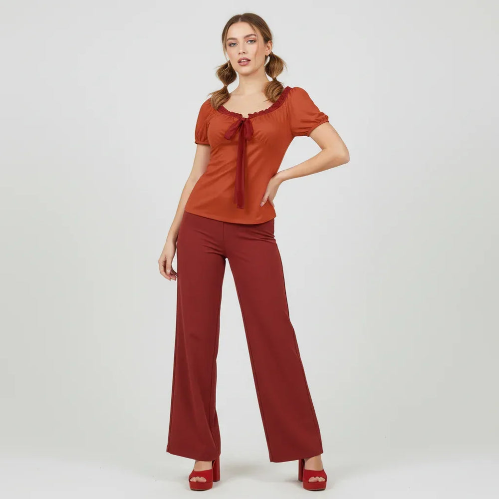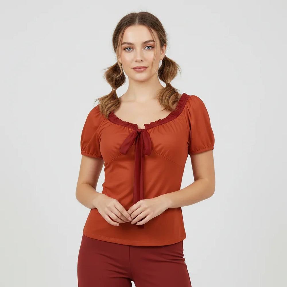 Turn up the heat in the Safrana Series Top, a romantic-meets-modern staple that spotlights our signature color play. Rendered in deep Mojo Red and finished with Old Brick Red trims, this tie-front style frames the neckline with soft ruffles and a graceful bow that you can adjust for the perfect cinch. Gently puffed sleeves and a sleek, body-skimming silhouette create an effortlessly flattering fit that moves from desk to dinner with ease. Style it with the Safrana Print Series for a statement set, or mix with the Safrana Color Series (think Old Brick Red bottoms) for a refined monochrome look.