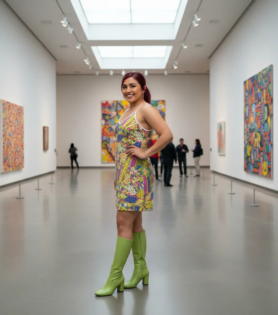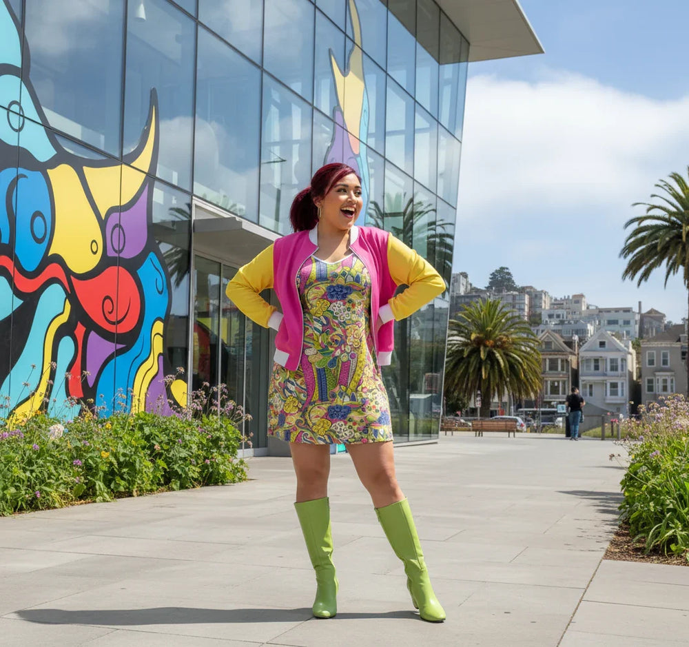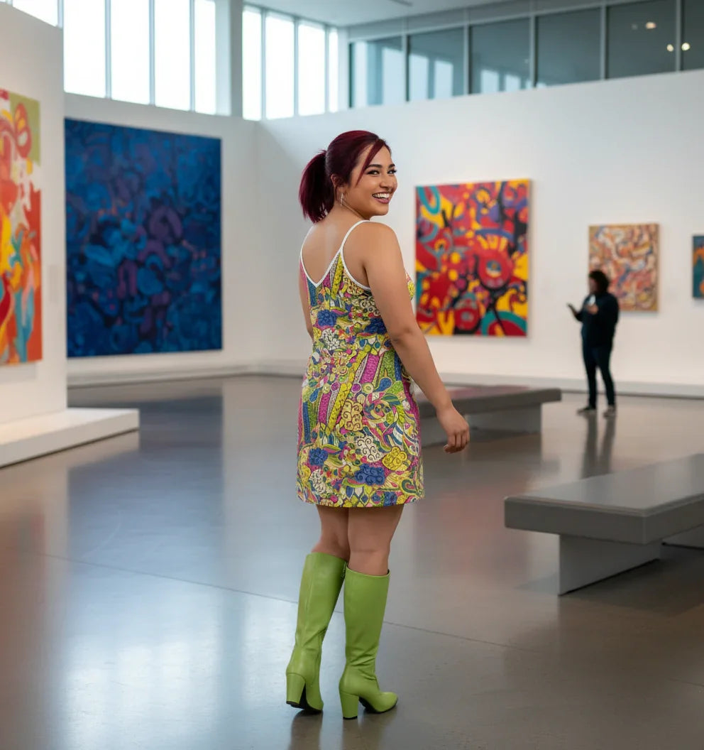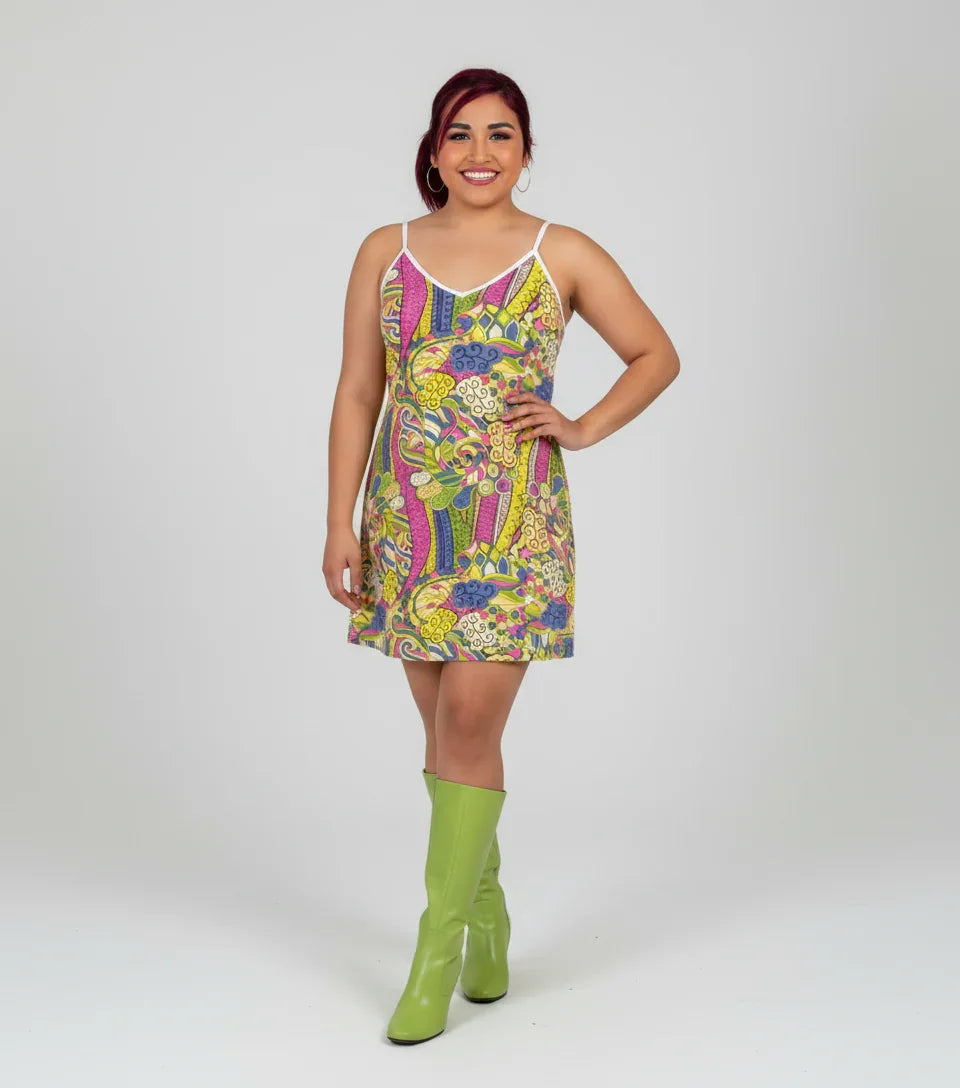レトロボヘミアンファッションにインスパイアされたSukiミニスリップドレスで、鮮やかな色彩と遊び心に満ちた世界を堪能してください。渦巻くような模様、幾何学的な抽象表現、そして遊び心のある花柄が織りなすこのドレスは、生地の上を舞い踊るように揺れ動き、ノスタルジックな感覚と躍動感を呼び起こします。この他に類を見ない、目を引くドレスを着て、現代社会に揺るぎない存在感を放ちましょう。