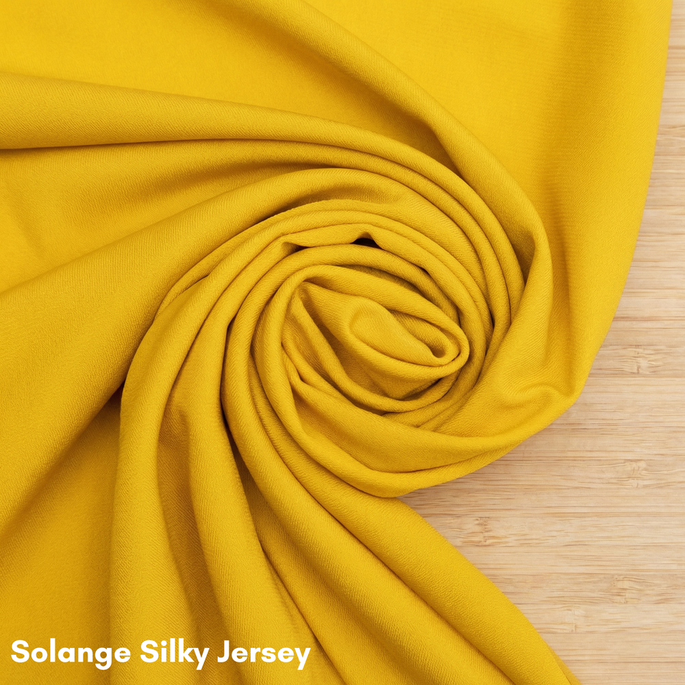 ソランジュ シルキージャージー:中厚の横編みシングルジャージーです。柔らかく弾力のある質感で、指通りも滑らかです。ソランジュ シルキージャージーの美しいドレープ感は、繊細でフェミニンなスタイリングに最適です。