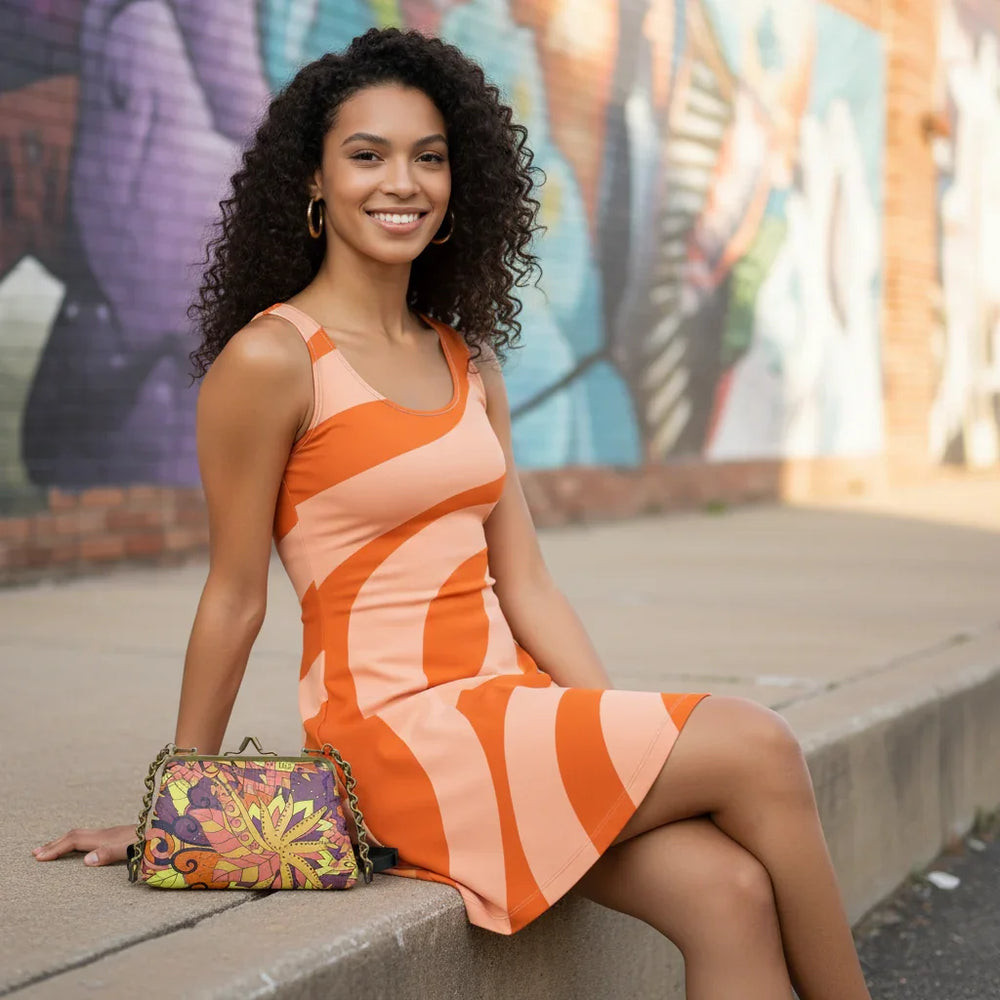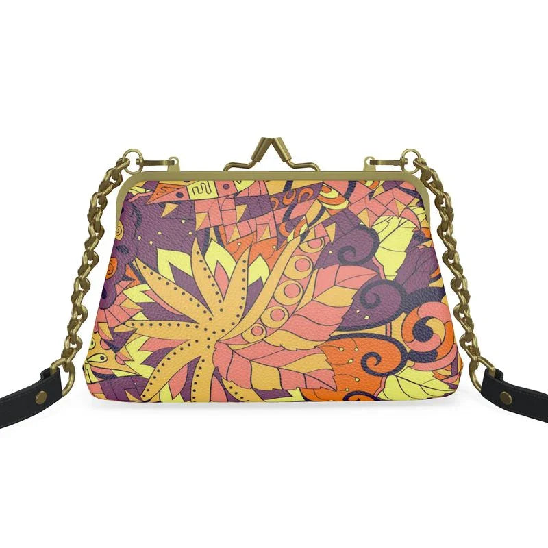 Elevate your ensemble with the Aki Print Leather Metal Frame Clutch, a masterpiece of artisanal craftsmanship that fuses psychedelic vibrancy with timeless elegance. Inspired by the swirling hues of autumnal foliage and abstract botanicals, this clutch boasts a mesmerizing multicolored print in rich shades of Tangerine Orange, golden yellow, and deep violet, rendered on premium 100% textured Nappa leather for a tactile, luxurious feel that exudes sophistication.