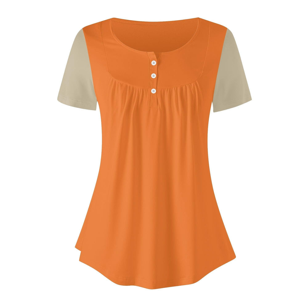Elevate your casual wardrobe with this chic and comfortable two-tone top. The vibrant orange body creates a stunning contrast against the warm yellow orange sleeves, offering a unique and eye-catching look. The gathered front with three delicate buttons adds a touch of feminine charm, while the flowy silhouette ensures all-day comfort and flatters various body types.