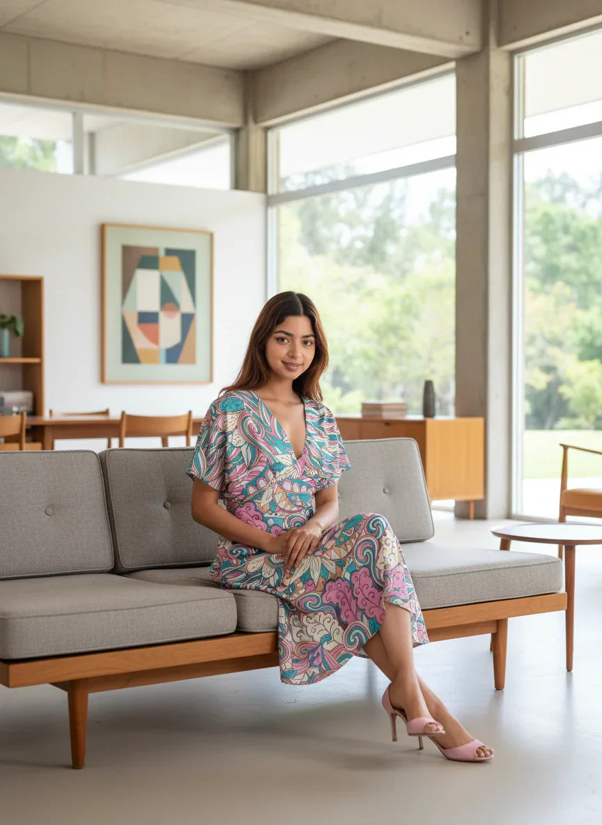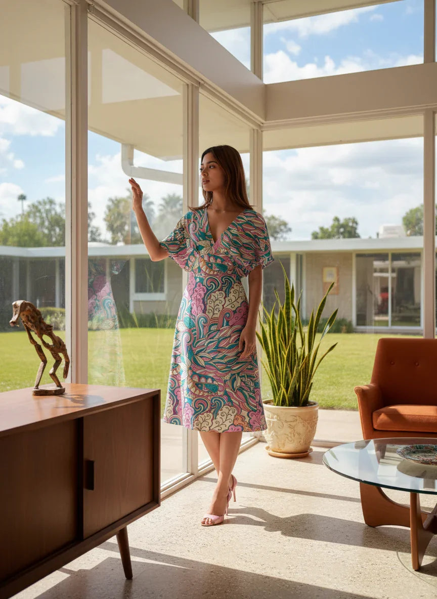 Experience a captivating blend of rich and subdued shades with our Arane Midi Dress, featuring the stunning combination of Tickle Me Pink, Persian Green, Sandy Yellow Brown, Tahuna Sands, and Tawny Port Red. The end result is a visually striking and abstract fusion that perfectly harmonizes for an elegant and cohesive look.