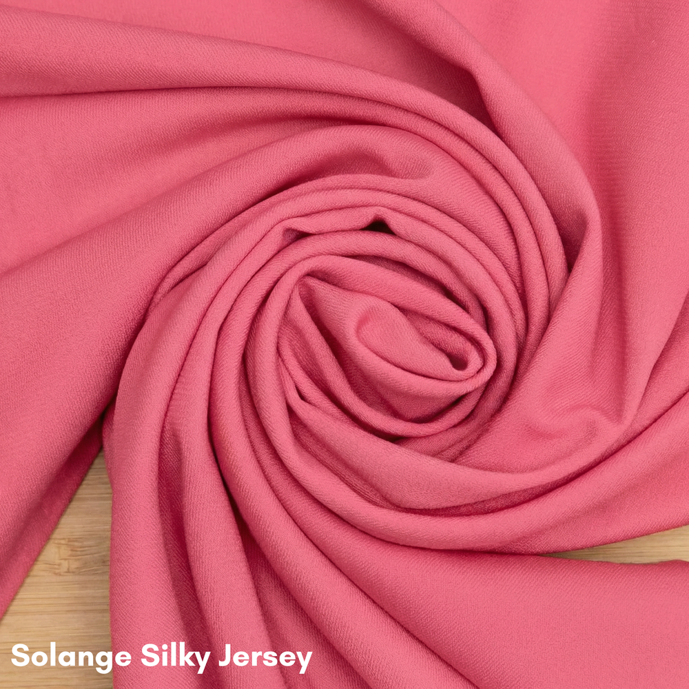 Solange Silky Jersey: (95% Polyester 5% Spandex) This is a mid-weight, weft knitted, single jersey. It has a soft, bouncy texture which smoothly glides through your fingers. The superb drape of Solange Silky Jersey makes it ideal for delicate, feminine styling.