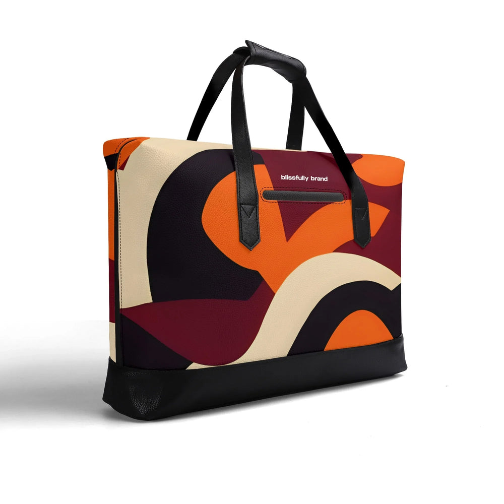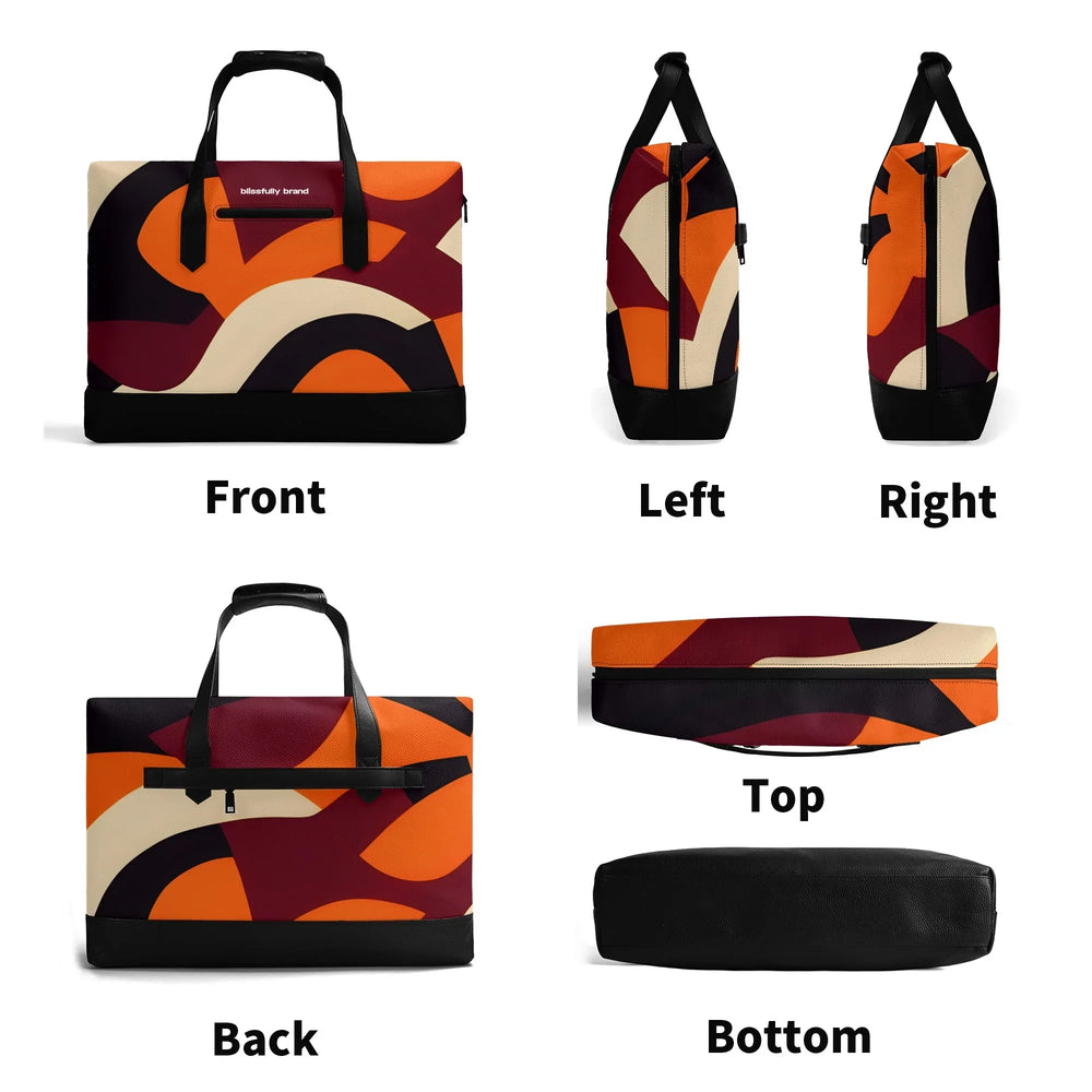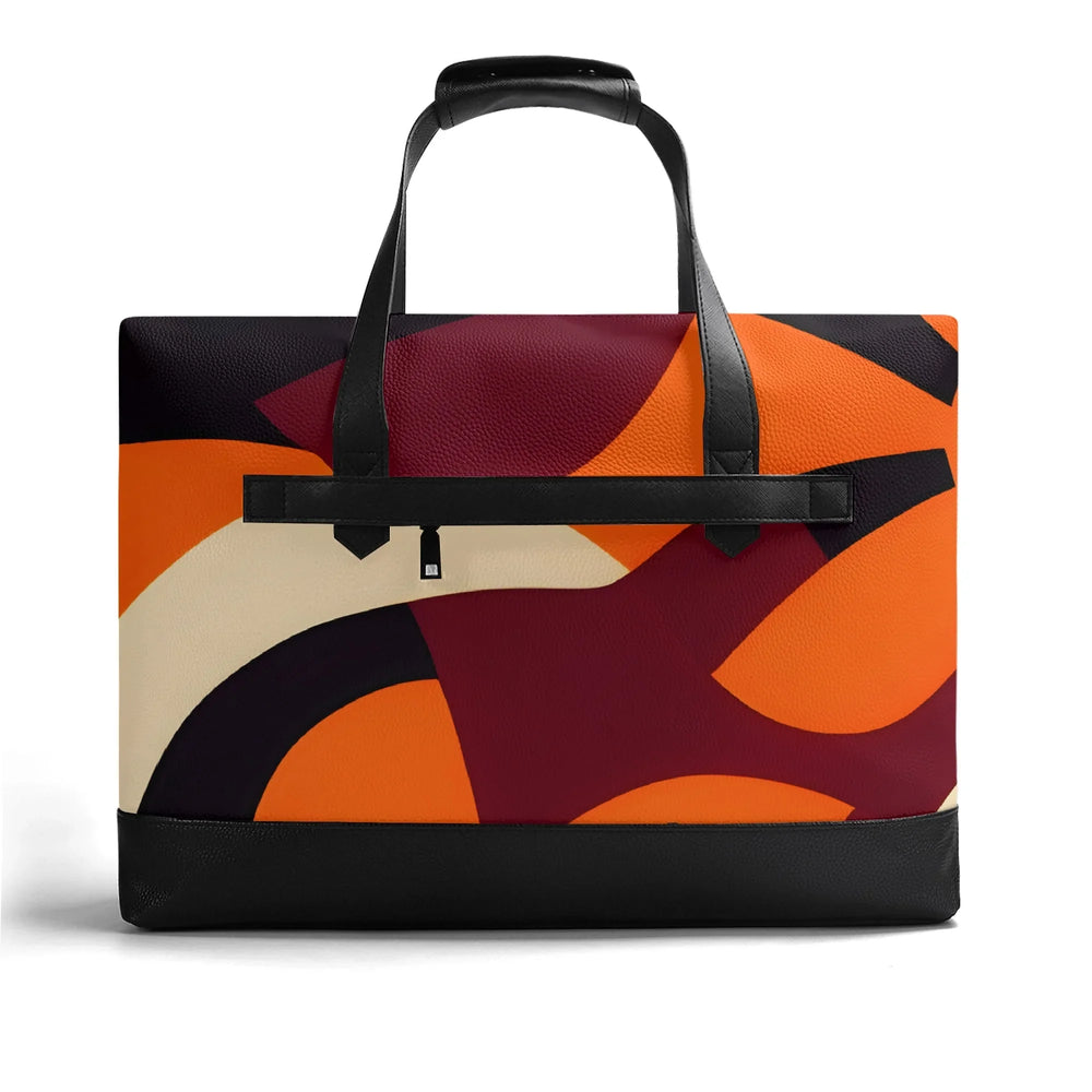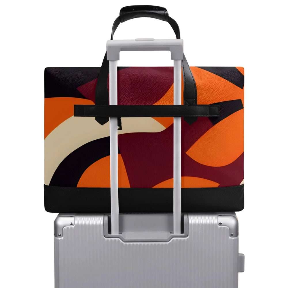 Elevate your travel game with the Airline Series Faux Leather Travel Bag — where bold design meets seamless practicality. The vibrant, abstract pattern featuring energetic tones of orange, maroon, and cream is a true standout, giving your journey a fashion-forward edge.