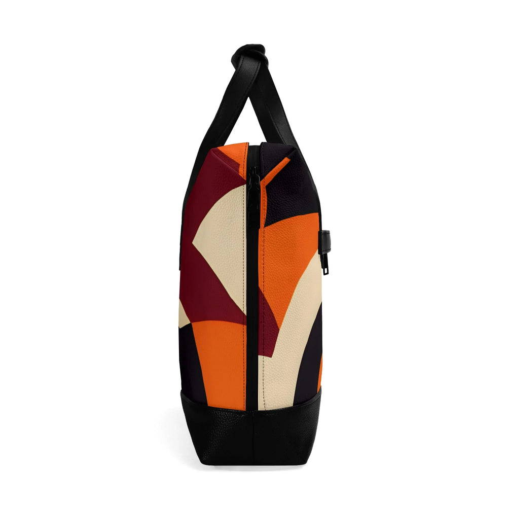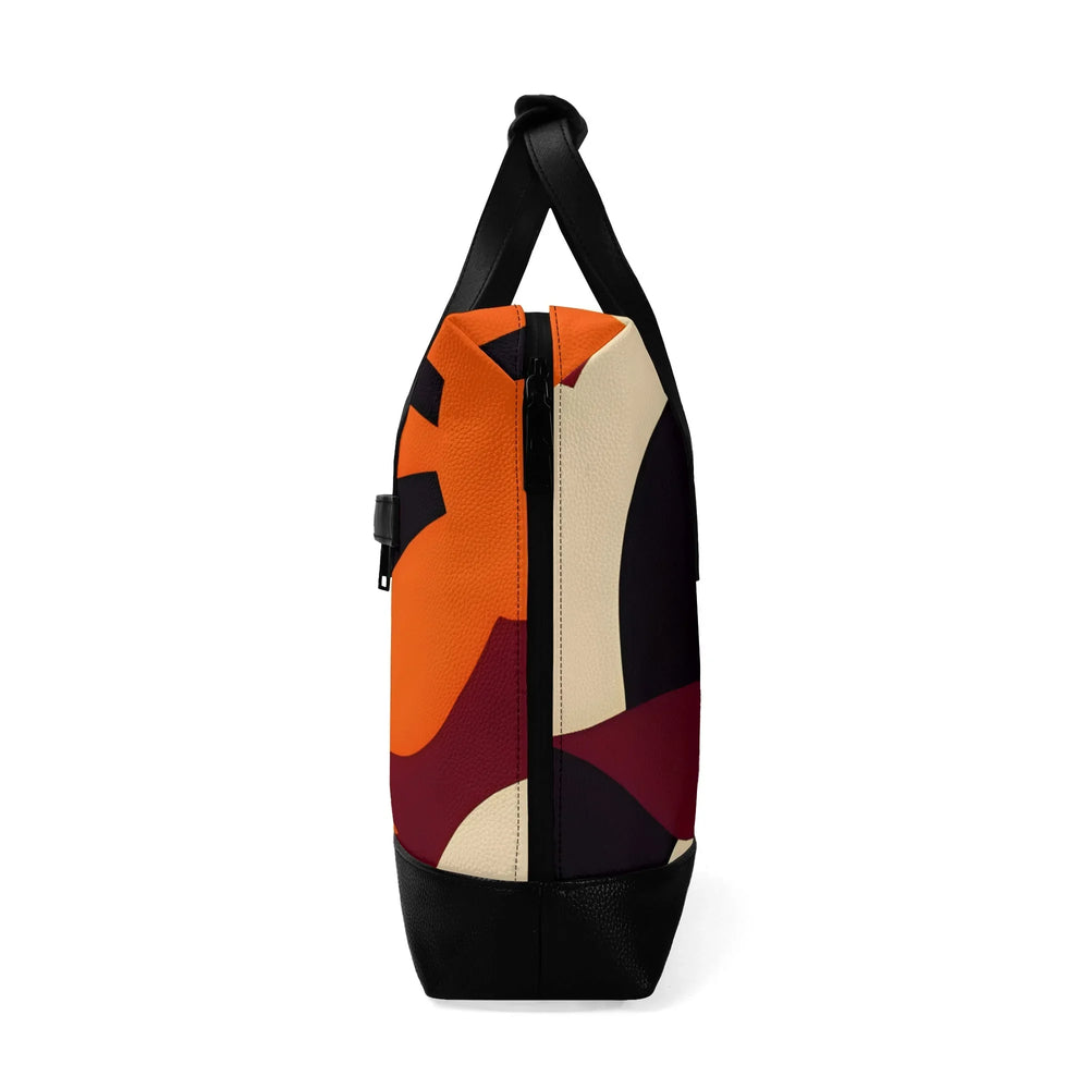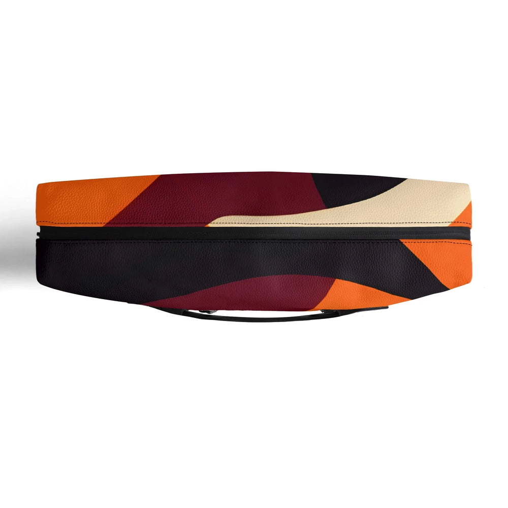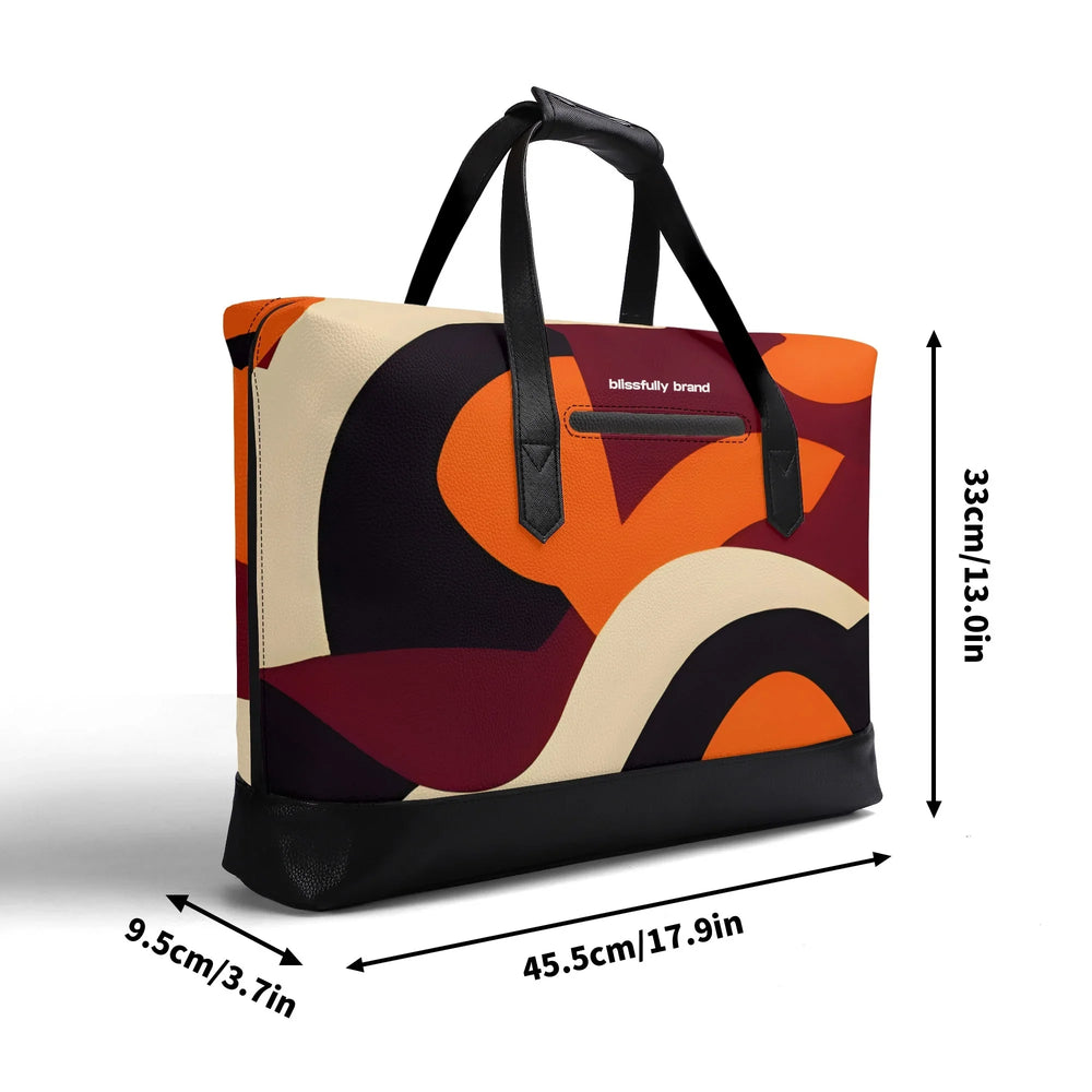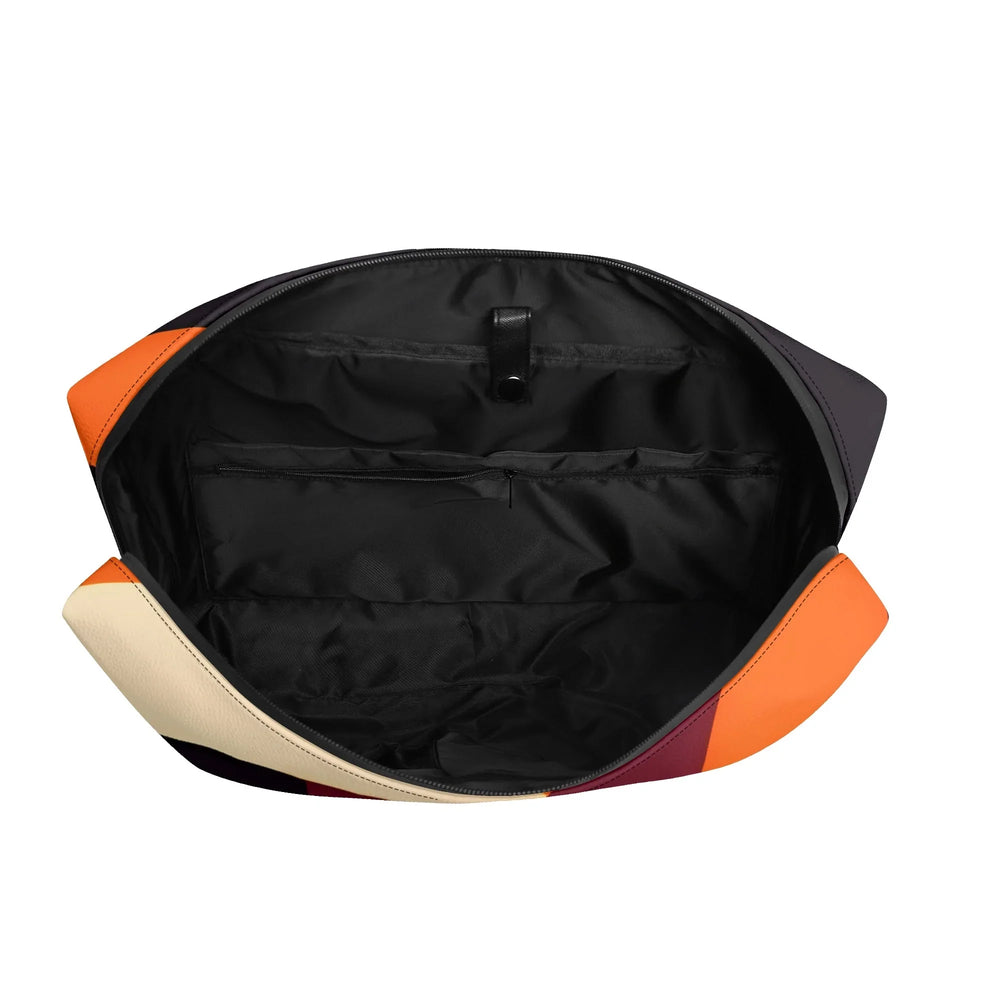 Experience the bold, modern design of our Copenhagen Faux Leather Travel Bag - Airline Series. The abstract pattern features a captivating blend of Deep Rosewood, Jaguar Black, International Orange, and Peach Cream, evoking the bold, refined aesthetic of mid-20th-century abstract art. With its striking contrast of hues and interplay of flowing curves and sharp edges, this bag is a statement piece that exudes confidence and elevated style. Upgrade your travel wardrobe with this luxurious and innovative bag that celebrates your passion for fashion.