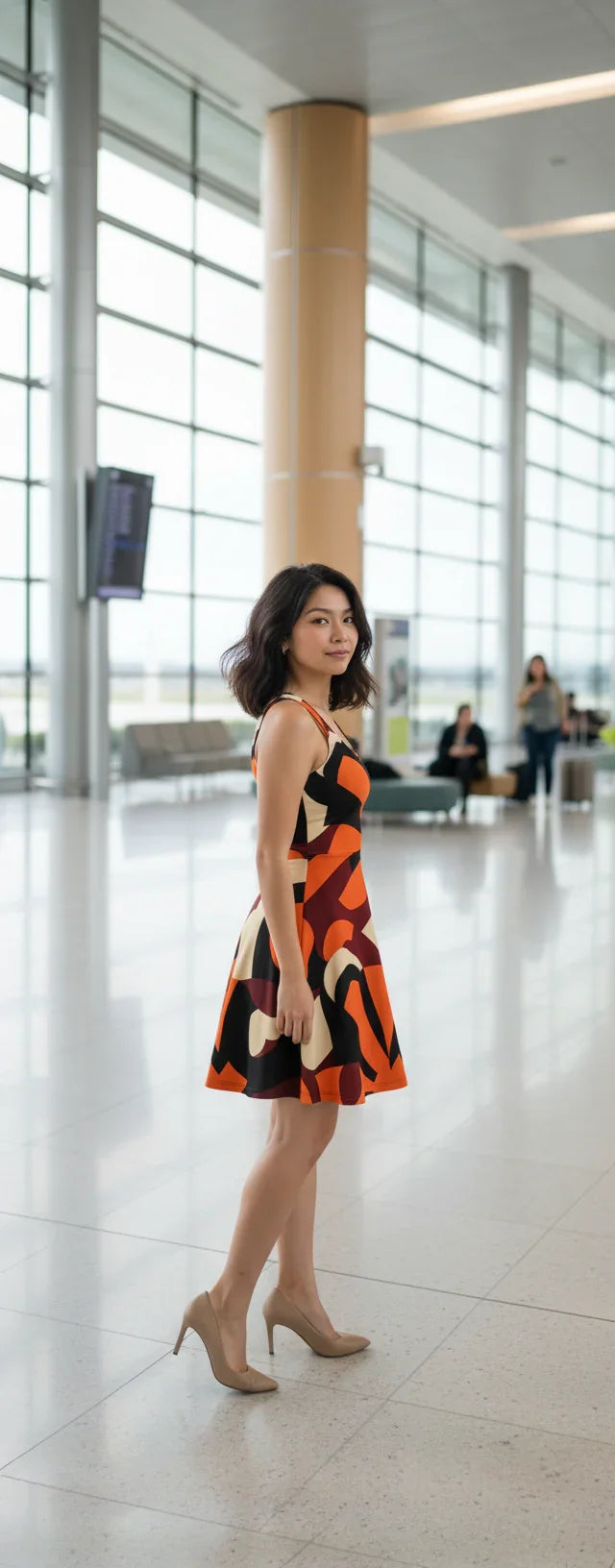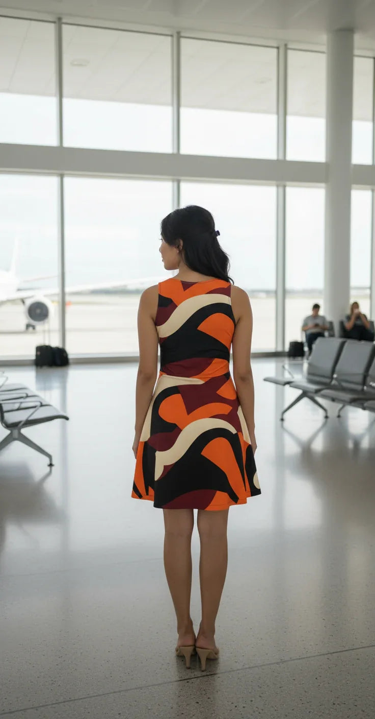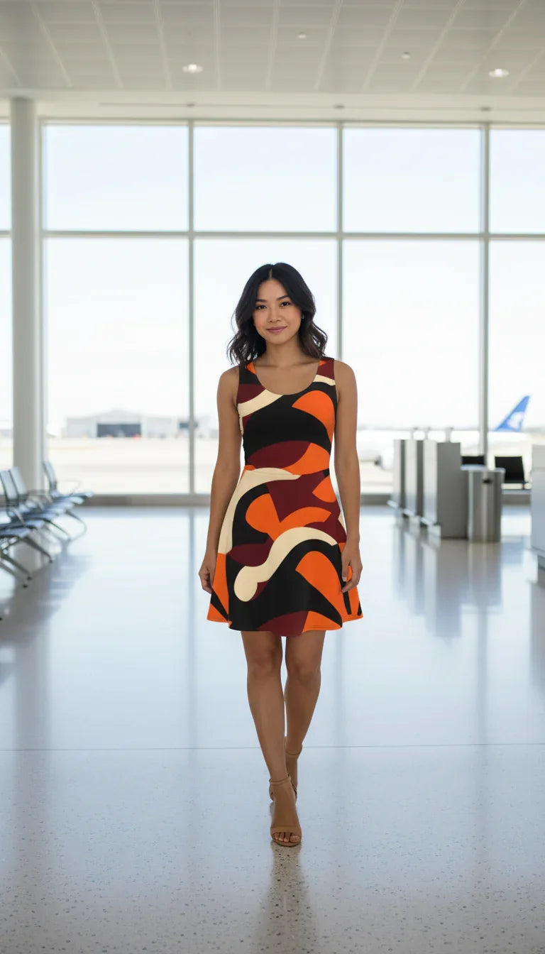This dress showcases our avant-garde Copenhagen pattern, combining a rich palette of Deep Rosewood & Jaguar Black, vibrant International Orange, and crisp Peach Cream masterfully interwoven with fluid, organic shapes. The abstract design hints at a sophisticated, modernist aesthetic, reminiscent of mid-20th-century abstract art. The bold contrast between colors and the interplay of sweeping curves and sharp angles create a dynamic visual rhythm that is both captivating and elegant. This pattern not only celebrates an artistic, expressive fashion sensibility but also ensures the dress stands as a statement piece, exuding confidence and contemporary flair.