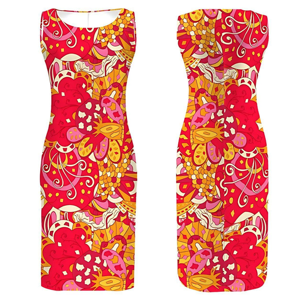 Experience the enchanting beauty of our Decora Sleeveless Sheath Dress, with a mesmerizing medley of shapes and patterns that exude liveliness, warmth, and charm. Sophisticated lines intertwine with artistic leaf motifs, creating a stunning fusion of accuracy and whimsy. The addition of geometric elements adds a touch of equilibrium and fascination, elevating the dress to a higher level of sophistication.