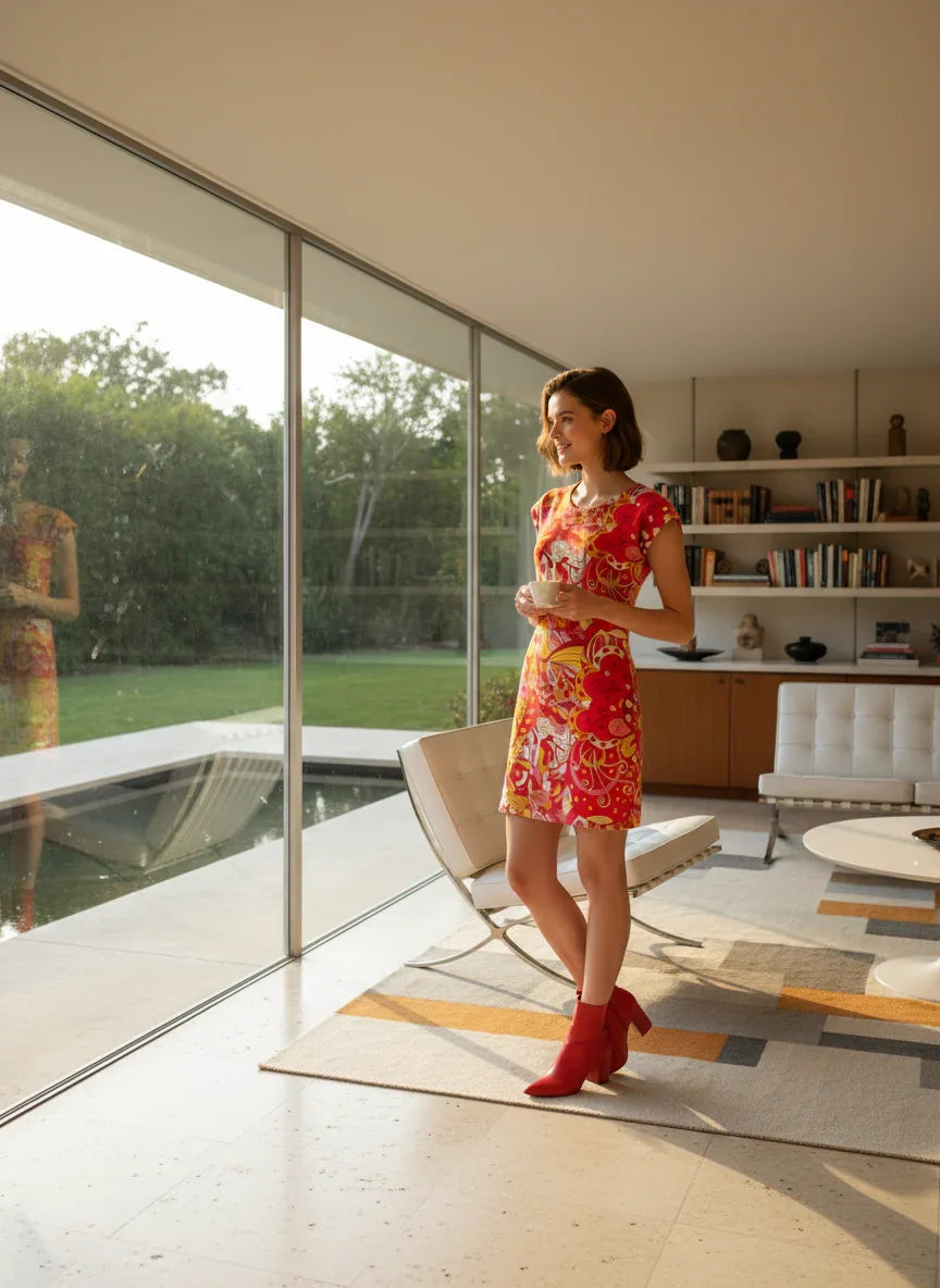 Experience the enchantment of our Decora print, featuring a diverse array of shapes and motifs that add a distinctive touch, inviting warmth, and lively personality to your outfits. Flowing and curved patterns intertwine with stylized foliage, harmoniously balancing precision and whimsy for a breathtaking visual display. The geometric elements create a sense of equilibrium and fascination, punctuating the design with moments of sophistication that enchant the beholder.