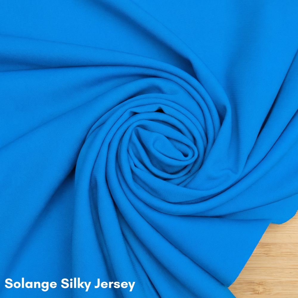 Solange Silky Jersey: (95% Polyester 5% Spandex) This is a mid-weight, weft knitted, single jersey. It has a soft, bouncy texture which smoothly glides through your fingers. The superb drape of Solange Silky Jersey makes it ideal for delicate, feminine styling.