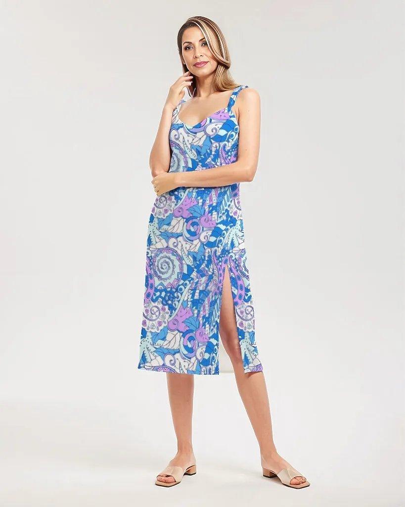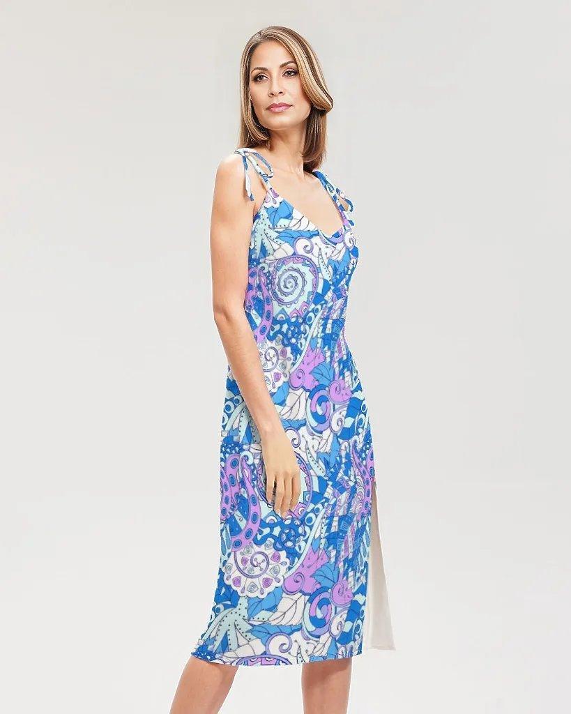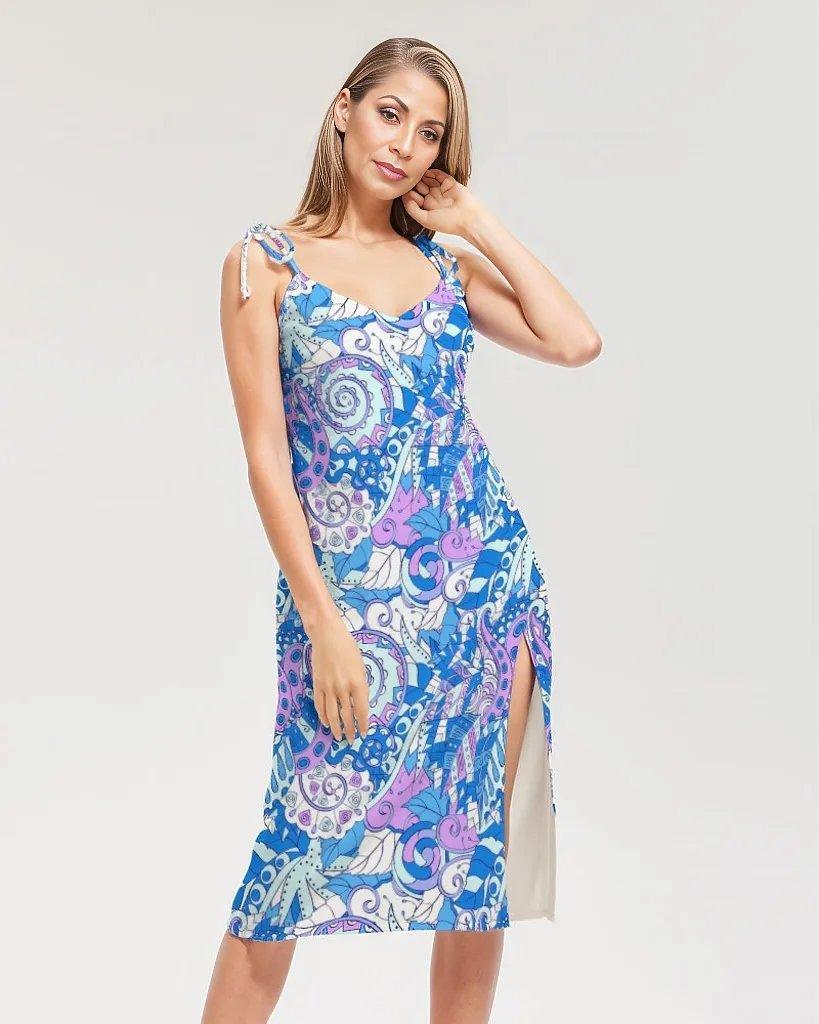 The adjustable shoulder ties provide a personalized fit, accentuating your silhouette while offering a chic, laid-back vibe. The dress features a flattering V-neckline that elongates your figure, and the sultry side slit adds a touch of allure, perfect for day-to-night transitions. Whether you're heading to a brunch with friends, an afternoon stroll, or an evening beach party, this versatile midi dress is your go-to choice.