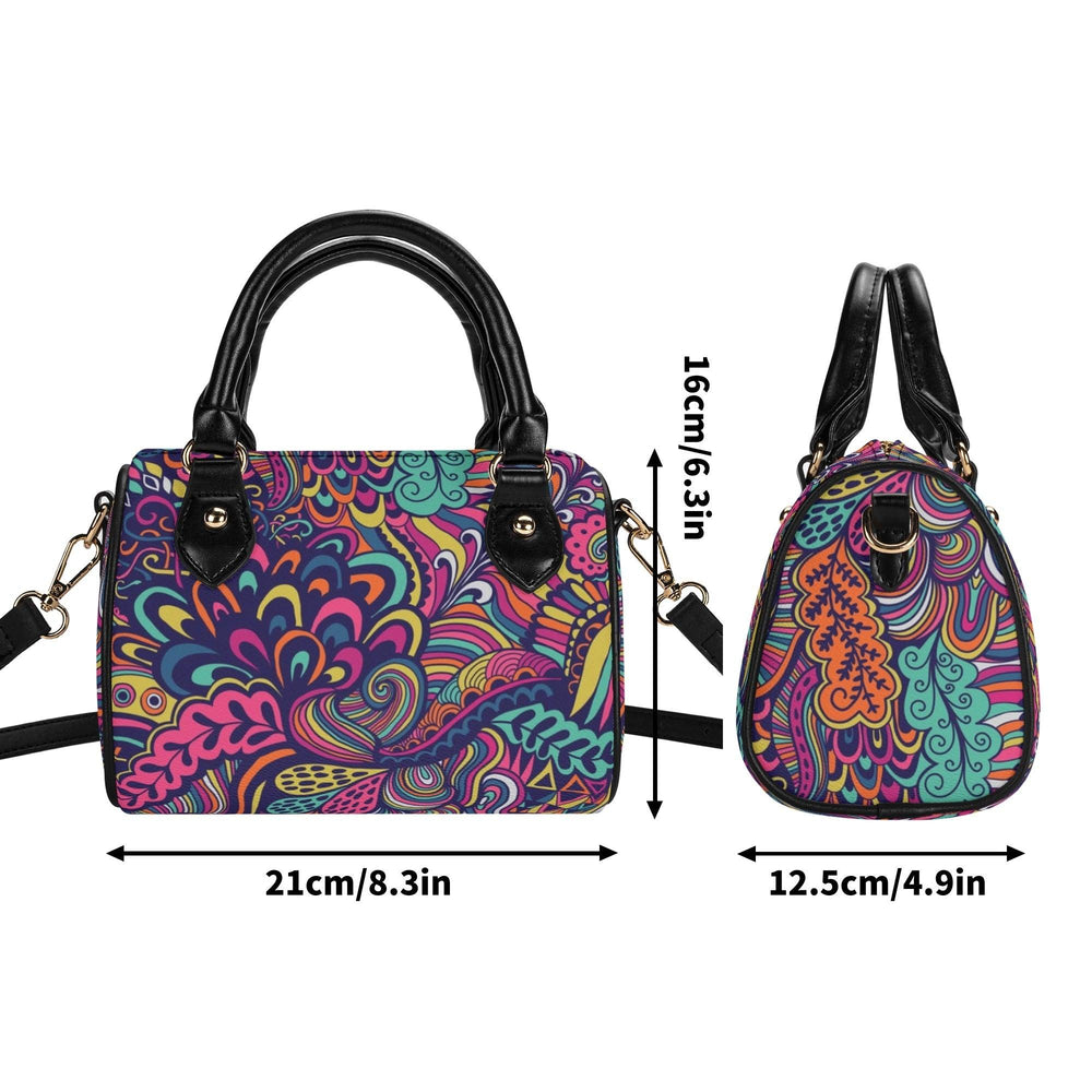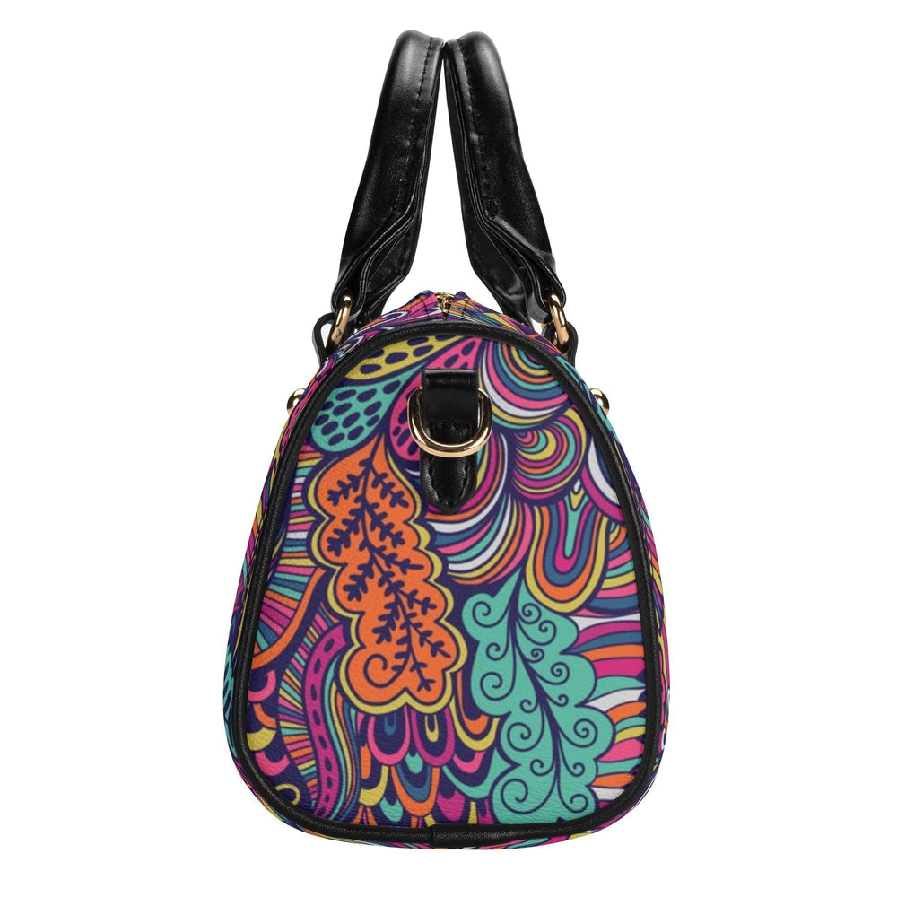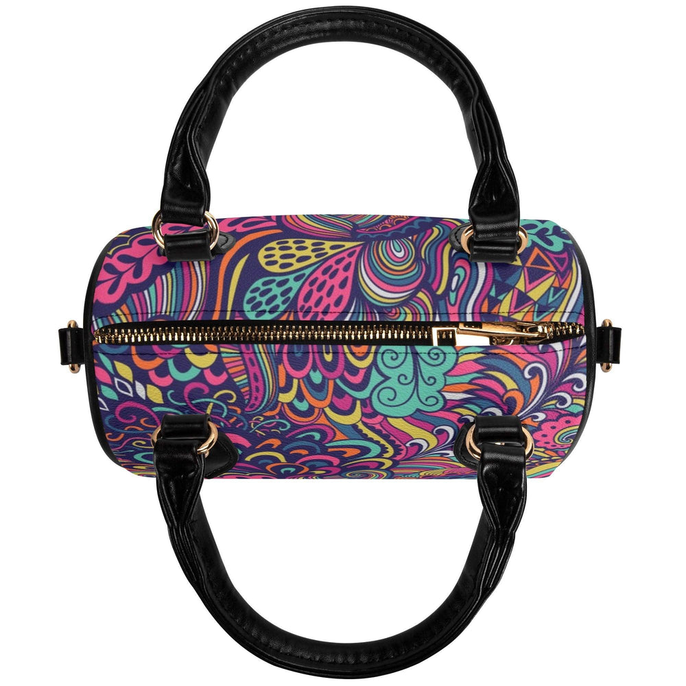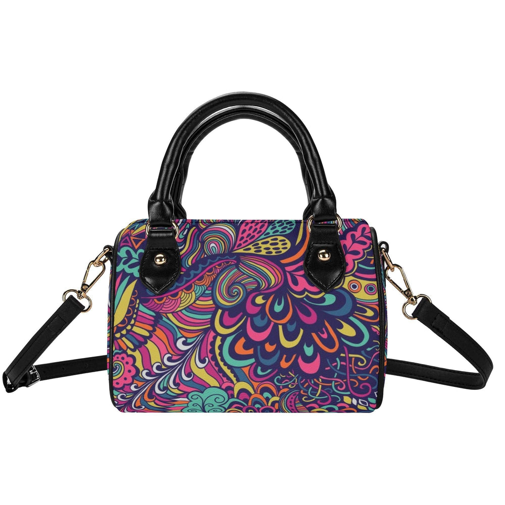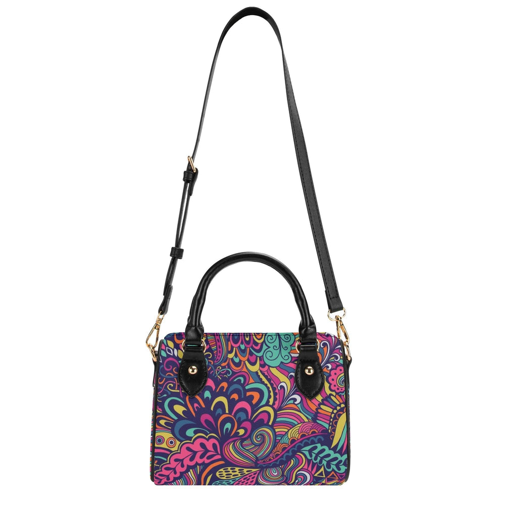 Make an unforgettable fashion statement with the Juhla Bag, a bold and vibrant accessory that every fashionista needs in their collection. Bursting with an electrifying swirl of retro floral-inspired motifs and abstract shapes, this bag is a kaleidoscope of style. Its intricate design flaunts a harmonious marriage of vibrant pinks, deep blues, lush greens, and audacious yellows that evoke creativity and confidence. Perfect for those who refuse to blend into the background, the bag's pattern offers a touch of bohemian elegance blended with cosmopolitan chic.