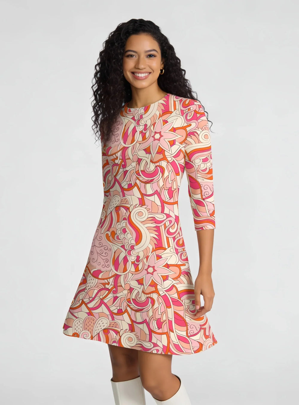 • Print: Keki retro swirl in coral, magenta, orange, and cream