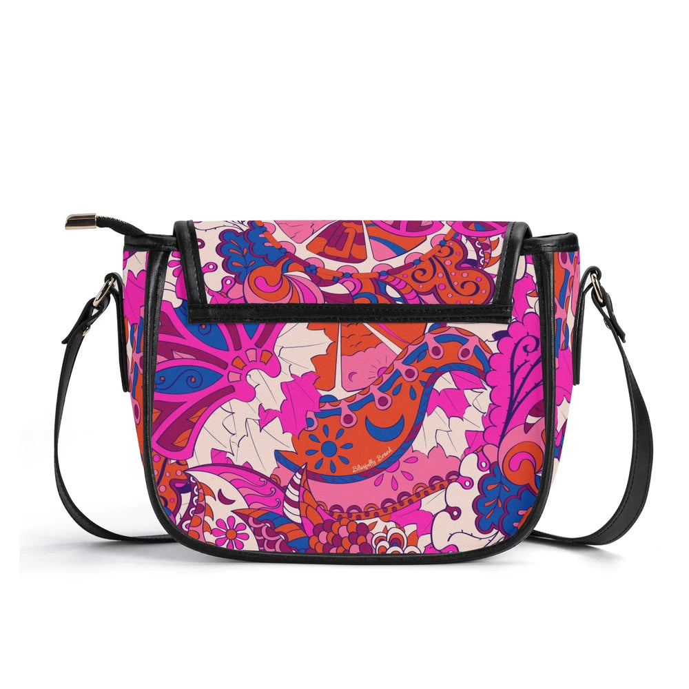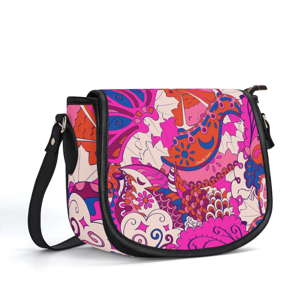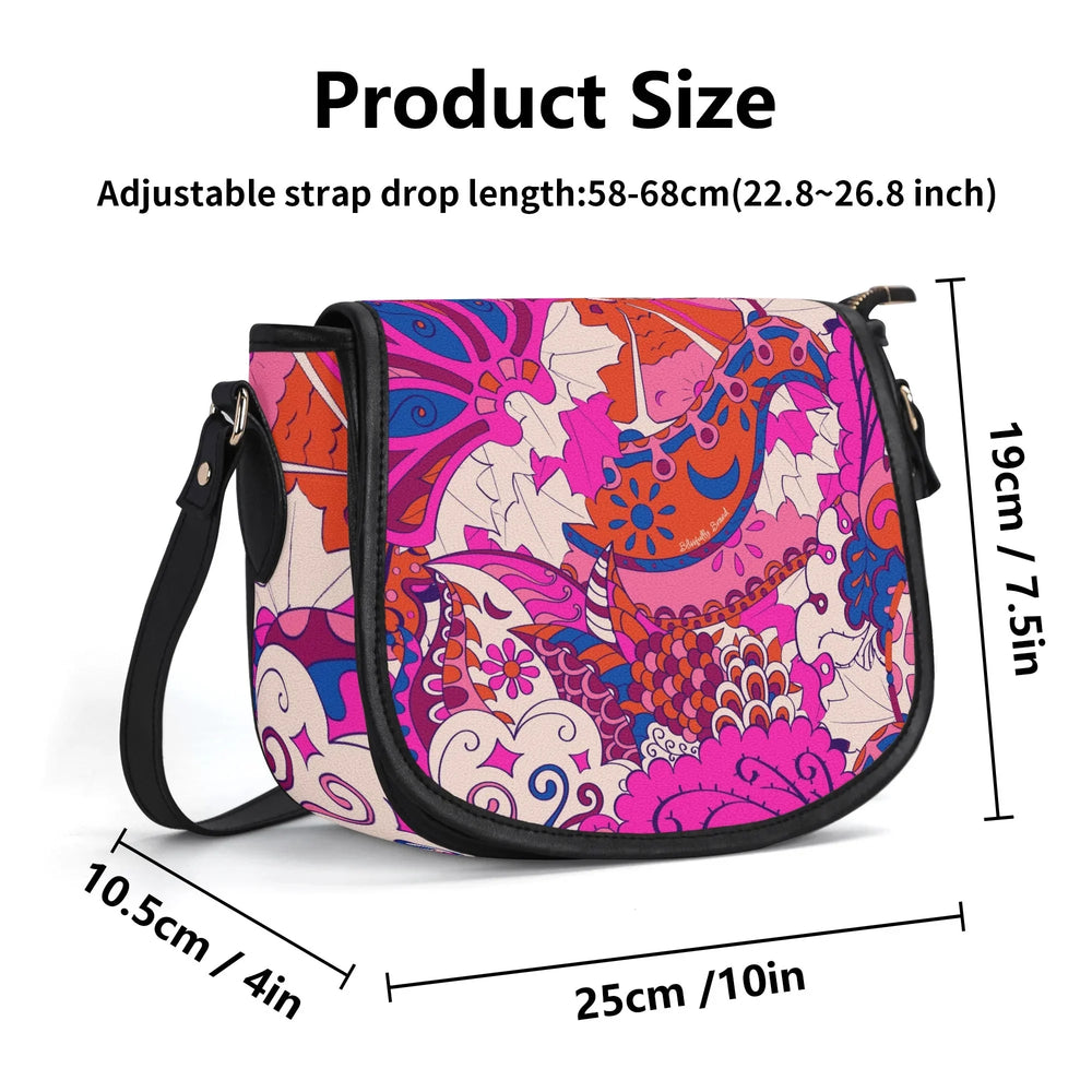 Ignite your personal style with the Sameria Print Saddle Bag, expertly crafted from premium top-grain leather. This show-stopping accessory boasts an electrifying blend of vivid pinks, bold purples, and lively blues in an energetic, artistic pattern inspired by modern bohemian fashion. Not only does it captivate with its eye-catching design, but the saddle bag also offers practical elegance—complete with a secure flap, adjustable leather strap, and enough room for your daily essentials. . Durable, chic, and utterly unique, this is the standout statement piece your wardrobe craves.