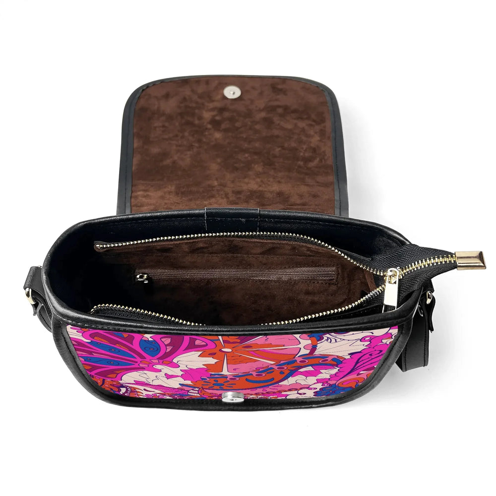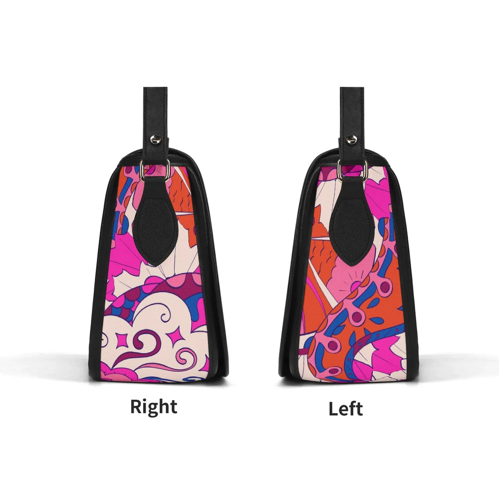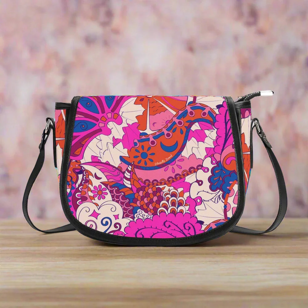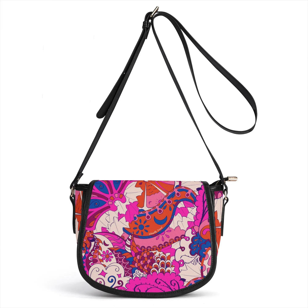Ignite your personal style with the Sameria Print Saddle Bag, expertly crafted from premium top-grain leather. This show-stopping accessory boasts an electrifying blend of vivid pinks, bold purples, and lively blues in an energetic, artistic pattern inspired by modern bohemian fashion. Not only does it captivate with its eye-catching design, but the saddle bag also offers practical elegance—complete with a secure flap, adjustable leather strap, and enough room for your daily essentials. . Durable, chic, and utterly unique, this is the standout statement piece your wardrobe craves.