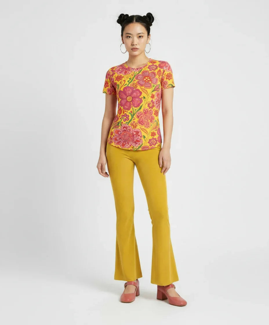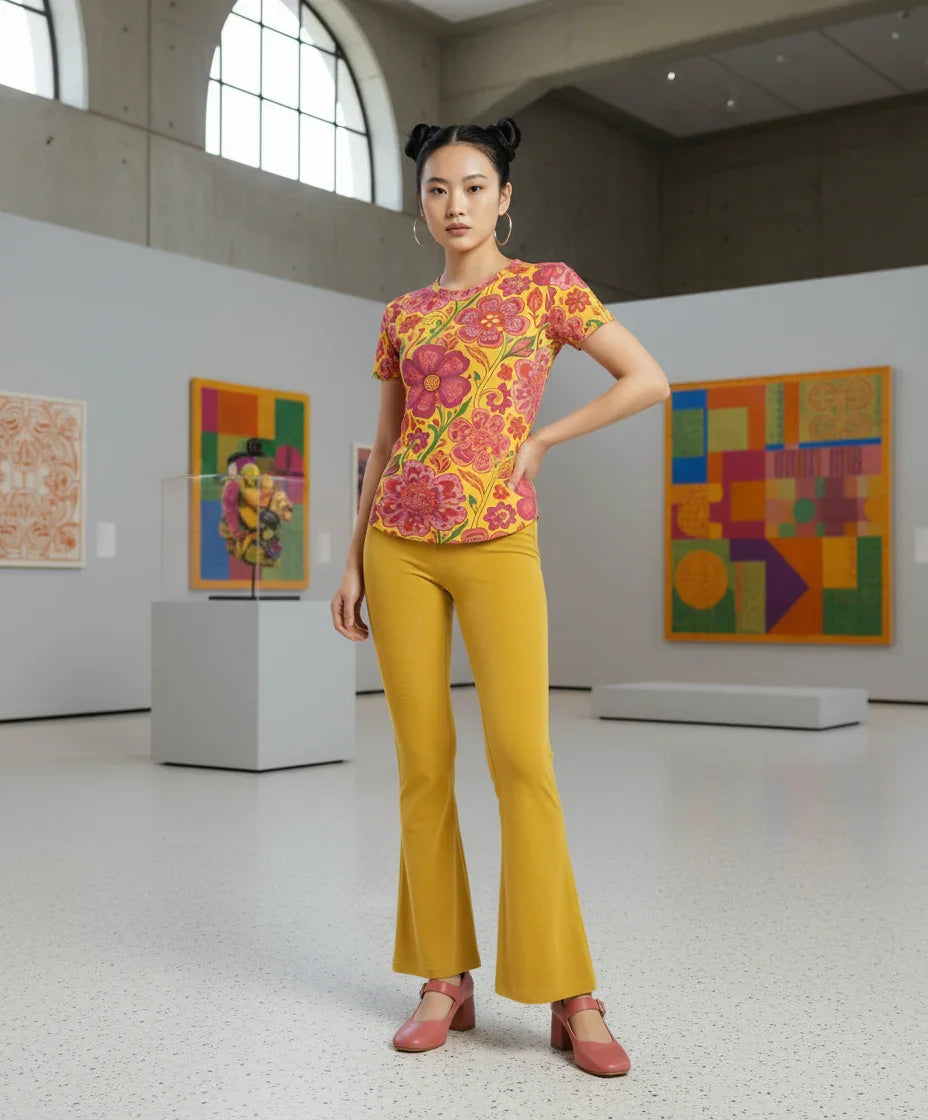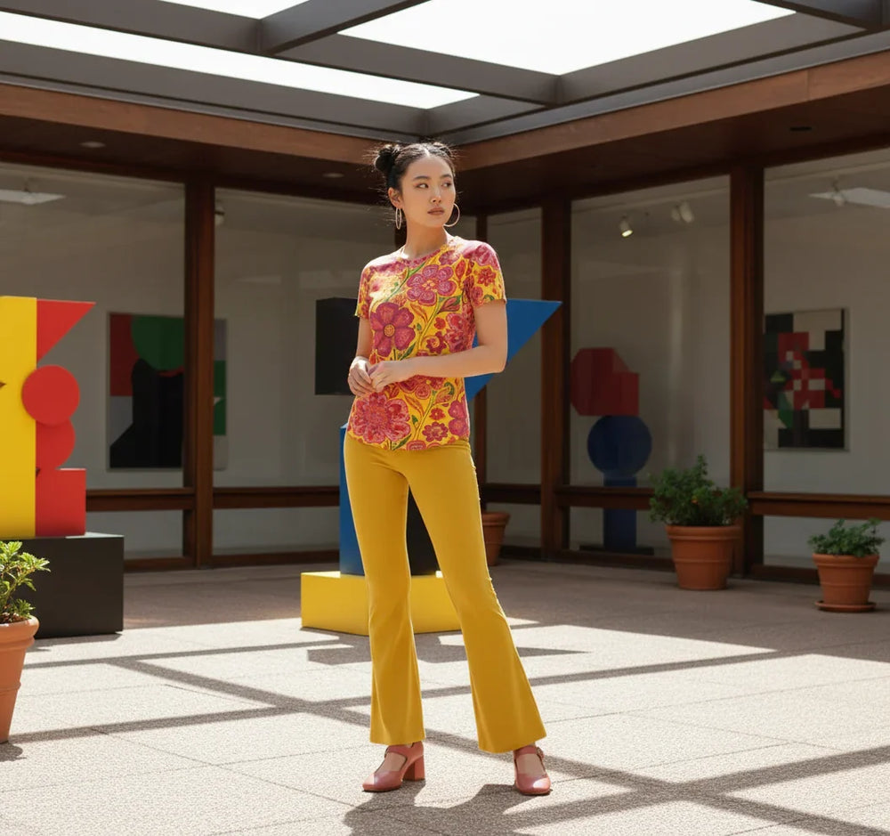 Step into a world of vibrant color and playful charm with our exquisite Limoncella Floral Print Tee. Inspired by sun-drenched Italian groves and the carefree spirit of a vintage summer, this t-shirt is more than just a garment – it's a mood-booster. Featuring an irresistible tapestry of bold fuchsia and rich magenta florals intertwined with lively emerald green foliage against a cheerful golden yellow backdrop, the Limoncella print evokes a joyful, retro-inspired aesthetic that's utterly captivating.