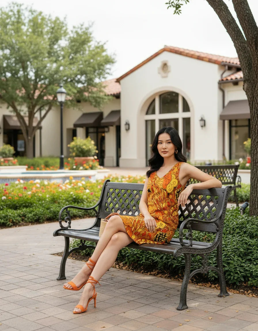 Unleash your adventurous spirit with the vibrant and cheerful colors of Vermilion Orange, Candlelight Yellow, Black, and Flush Orange in this delightful dress. Each lively hue shares a sunny tale, encouraging you to embrace its fun and enchanting energy.