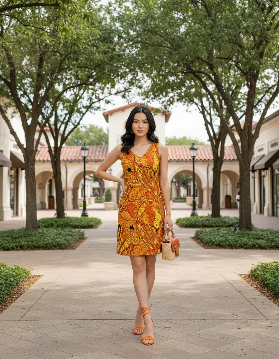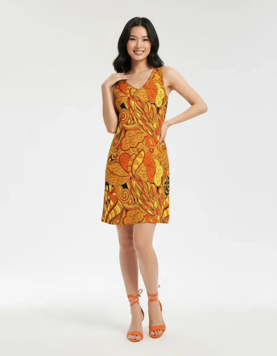 Here's a sleeveless mini masterpiece that's equal parts retro vibes and modern flair! Crafted from soft, breathable fabric that hugs your curves just right, this V-neck stunner explodes in a psychedelic symphony of fiery oranges, sunny yellows, and passionate reds, swirling into intricate floral and abstract motifs that demand attention. Perfect for festivals, summer parties, or turning heads on a night out, this dress channels '70s groove with a contemporary twist – empowering you to feel vibrant, confident, and utterly unstoppable.