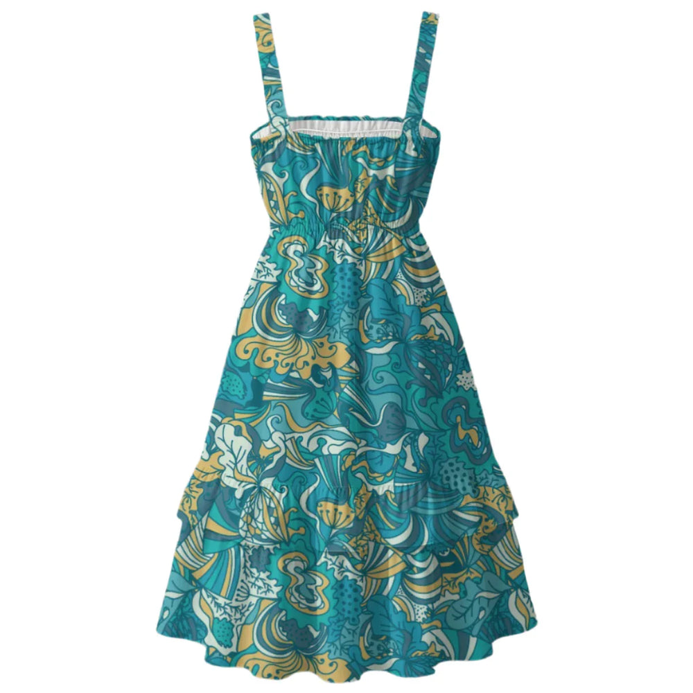 The eye-catching Masu print is a true celebration of nature's artistry, bringing whimsical florals and swirling patterns to life. A tiered, ruffled hem adds playful movement, making this dress ideal for garden parties, vacations, or sunny day strolls. Crafted from lightweight, breathable fabric, it keeps you cool and comfortable all day long.