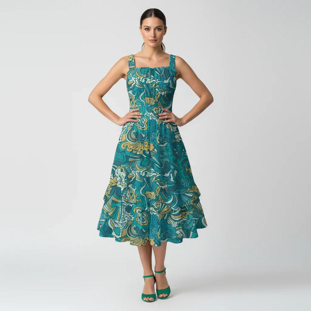 Step into a world of color and confidence with our Masu Print Dress! This bohemian-inspired midi dress features a lively blend of teal, emerald, and golden yellow—perfect for turning any day into a stylish statement. The flattering square neckline and ruched bodice shape your figure beautifully, while thick straps provide comfortable support.