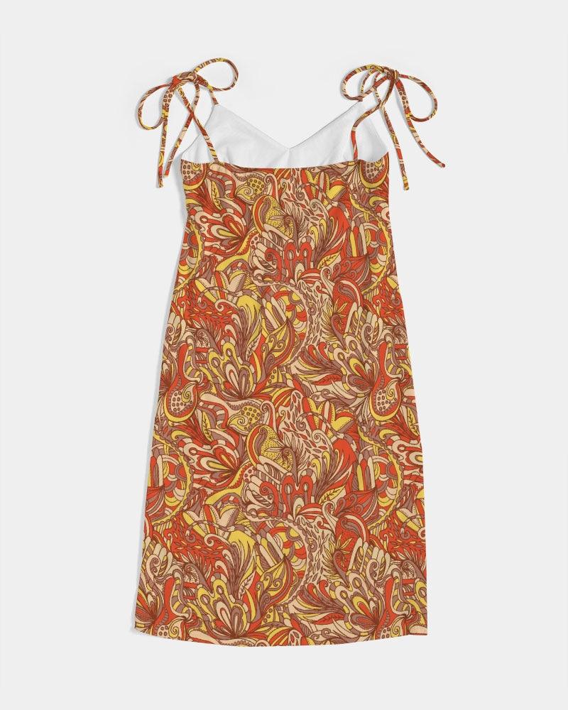 Step into a world of vibrant elegance with our enchanting Miarna Midi Dress! This stunning piece effortlessly combines bold artistry with timeless style. Featuring a mesmerizing leaf-inspired pattern in warm shades of orange, and yellow, this dress is perfect for those who love to make a statement. The flattering V-neckline and adjustable tie straps ensure a customized fit, while the side slit adds a hint of playful sophistication.