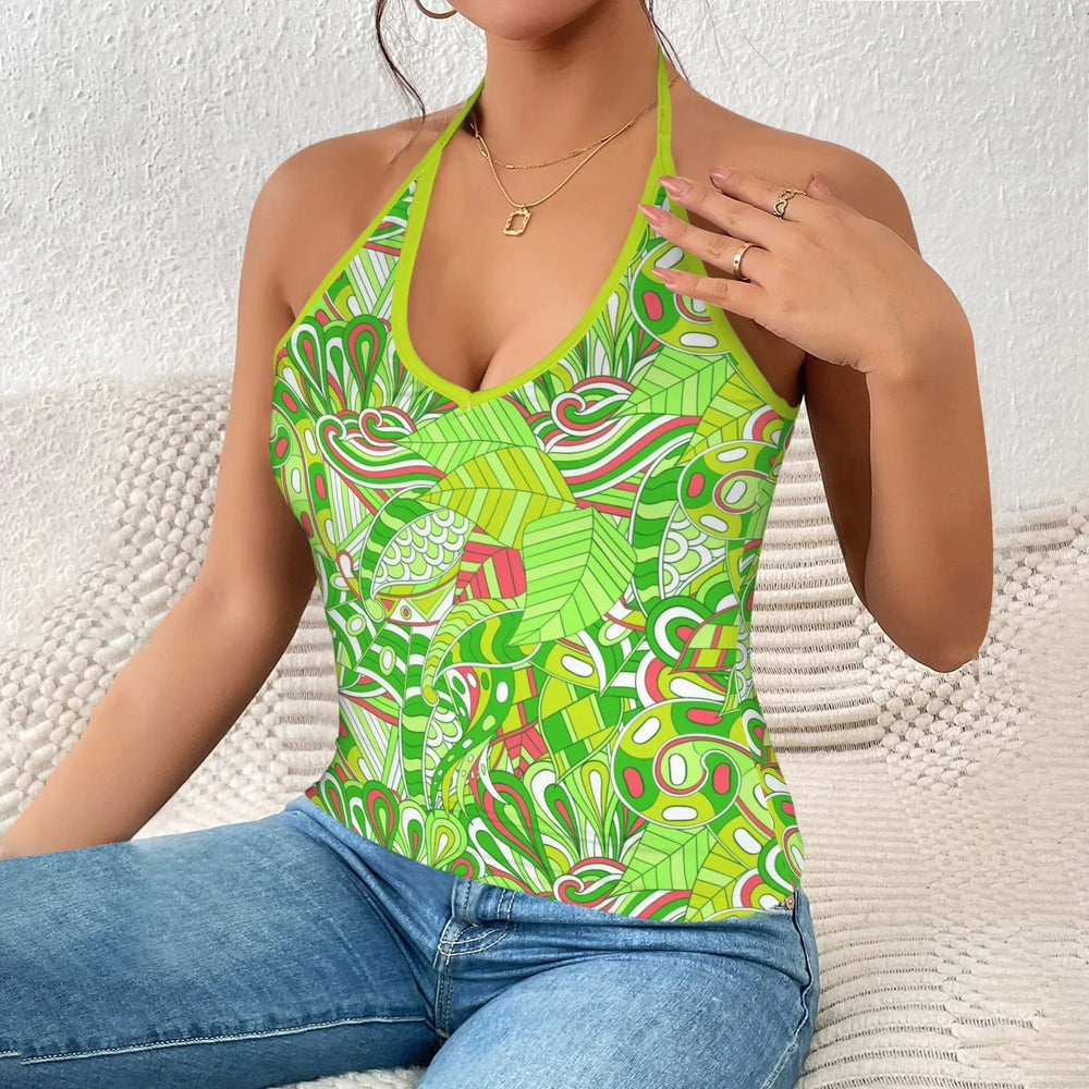 Step into vibrant style with our Midori Print Halter Cami Top, a perfect blend of comfort and fashion. This eye-catching top features a stunning green base adorned with intricate, colorful floral and abstract patterns, inspired by traditional Japanese art. The halter neck design provides a chic, summery look, while the lightweight fabric ensures you stay cool and comfortable all day long. Ideal for casual outings, beach days, or paired with high-waisted jeans for a trendy ensemble, this cami top is a must-have addition to your wardrobe. The adjustable neck tie allows for a customized fit, making it suitable for all body types. Embrace the spirit of summer with this unique and vibrant Midori print halter cami top.