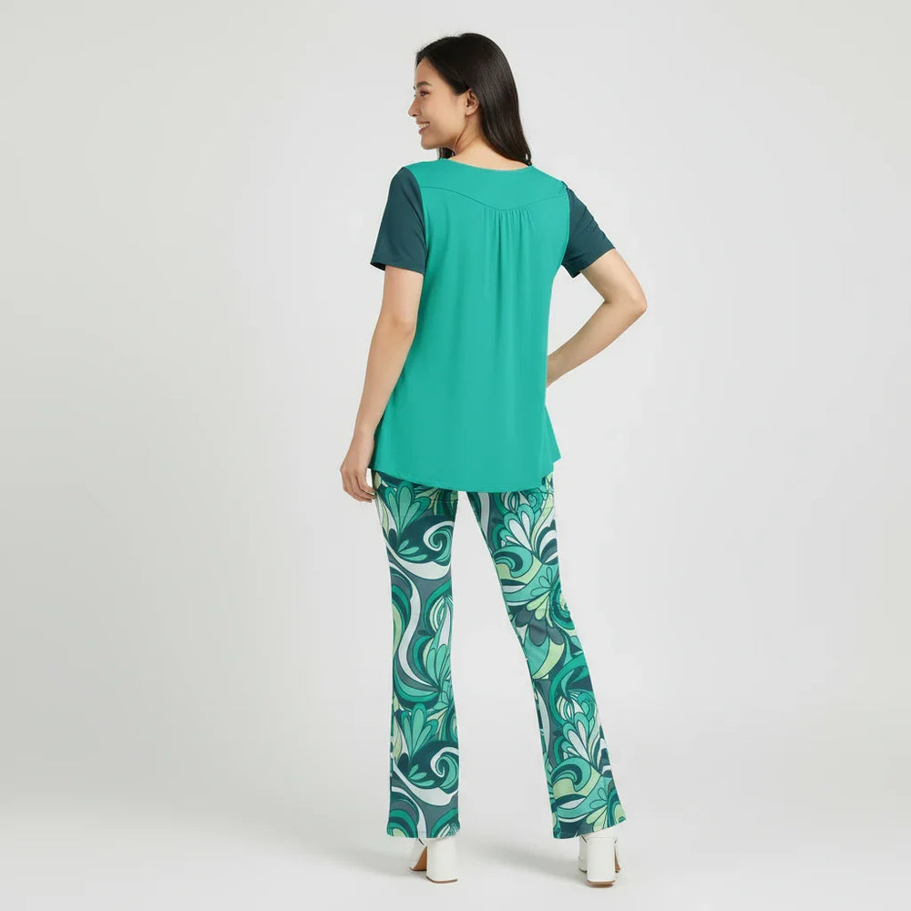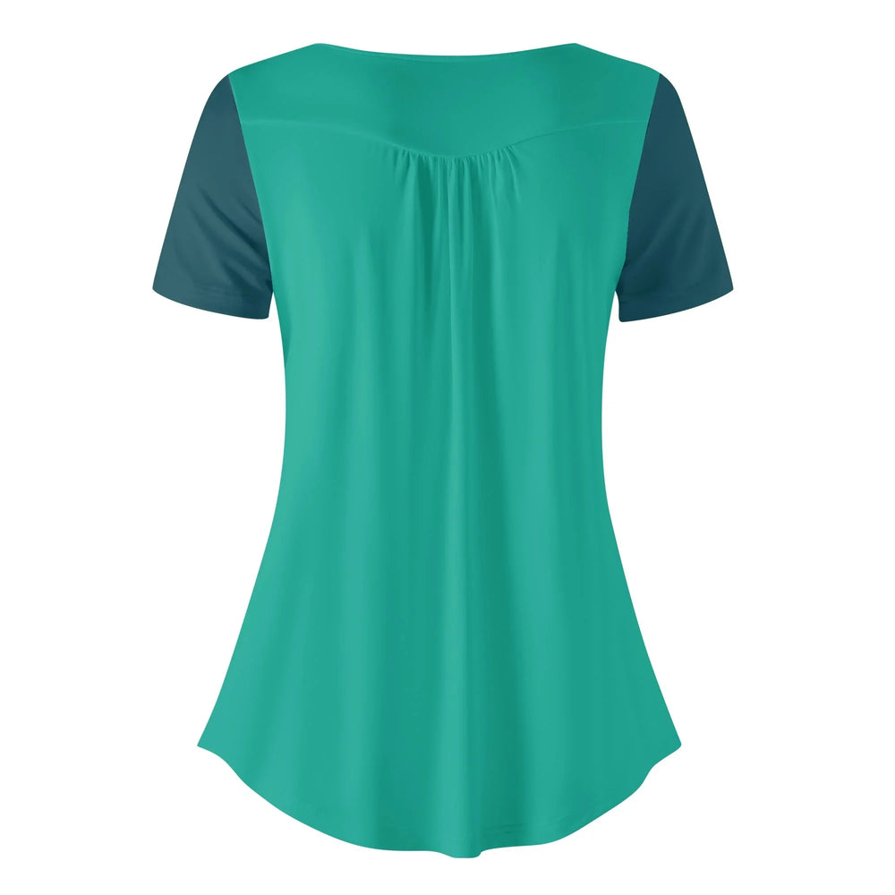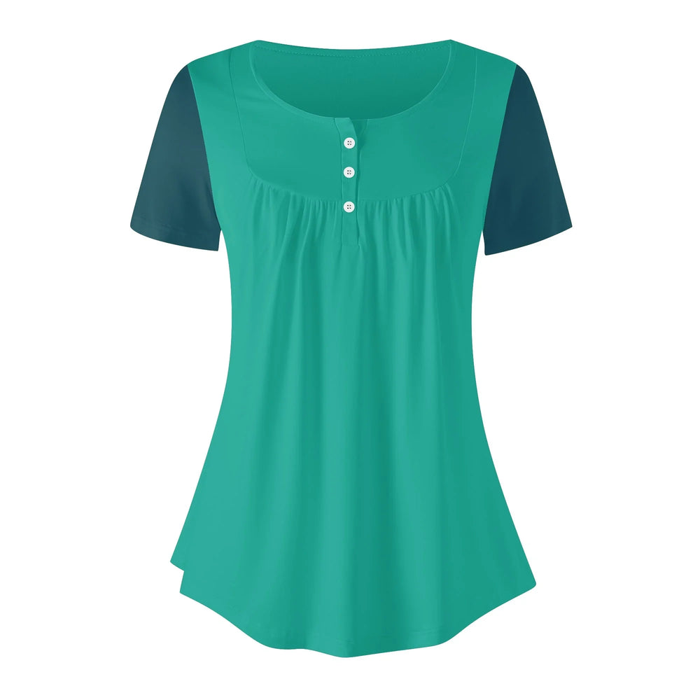Elevate your everyday wardrobe with our stunning teal Mima Color Series top, where comfort meets effortless style. This beautifully designed blouse features a flattering scoop neckline adorned with three delicate white buttons that add a touch of feminine charm. The thoughtful color-block design combines a vibrant Persian Green body with slightly darker blue teal sleeves, creating a slimming and contemporary silhouette. The gentle gathering below the buttons provides a relaxed fit that drapes beautifully over your figure, ensuring both comfort and style.