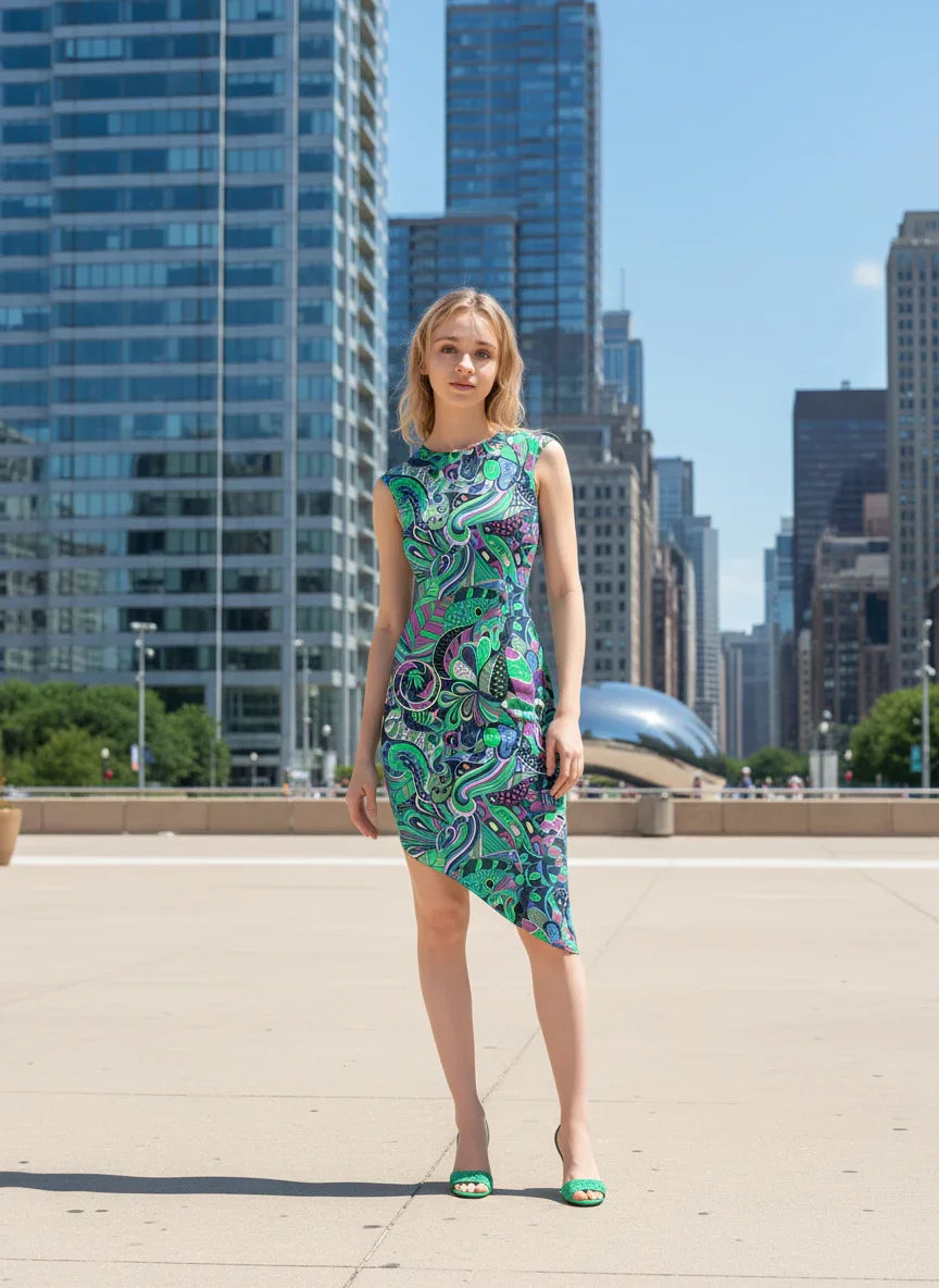 Experience a captivating voyage through enchanting hues - Spring Green, Outer Space Blue, Soft Peach, Cornflower Blue, Mulberry Violet, Bay Leaf Green, and bold Black - with this gorgeous midi dress. Every shade meticulously chosen to embody elegance and uniqueness.