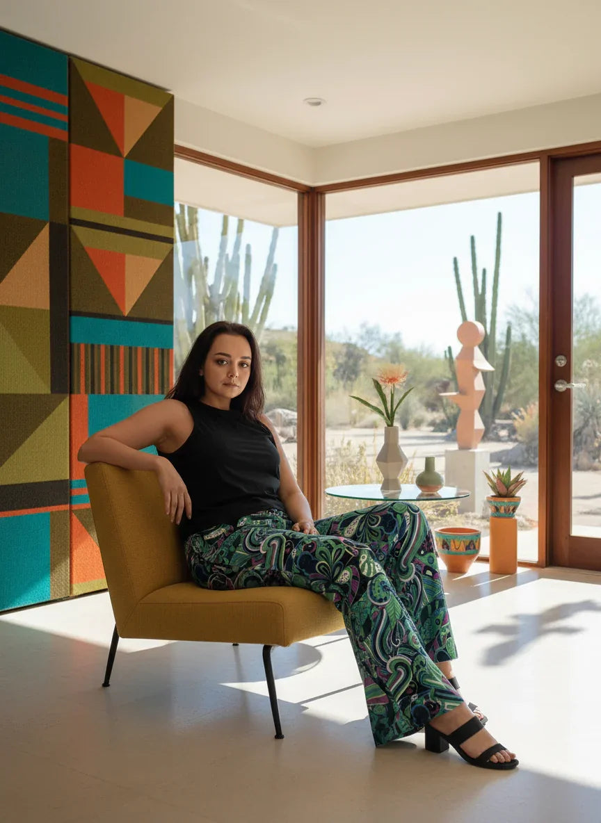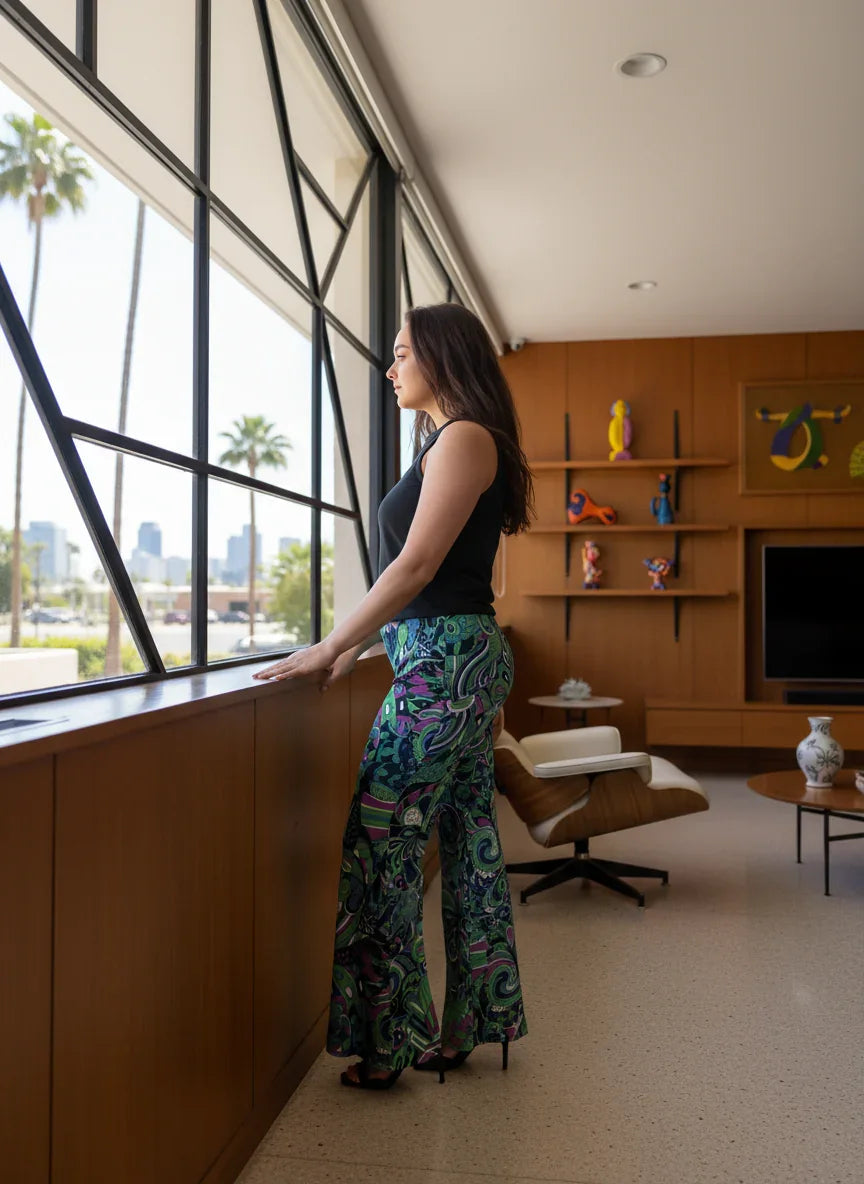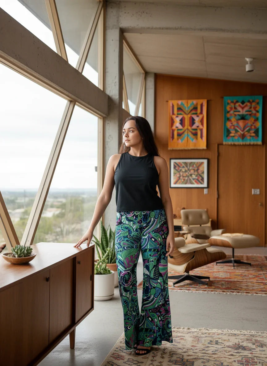 Versatile Styling: Pair these pants with a simple black tank top, as shown, for a minimalist yet striking look, or dress them up with a chic blouse for an evening out. The vibrant print adds an instant pop of color to any ensemble, making it easy to create eye-catching outfits.
