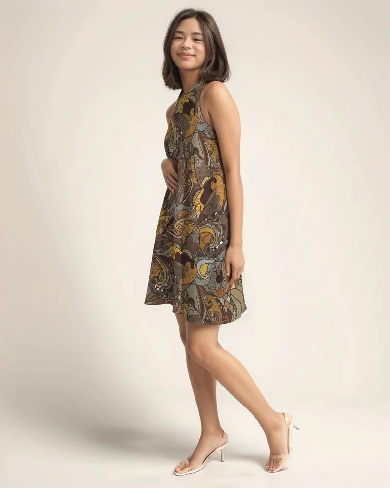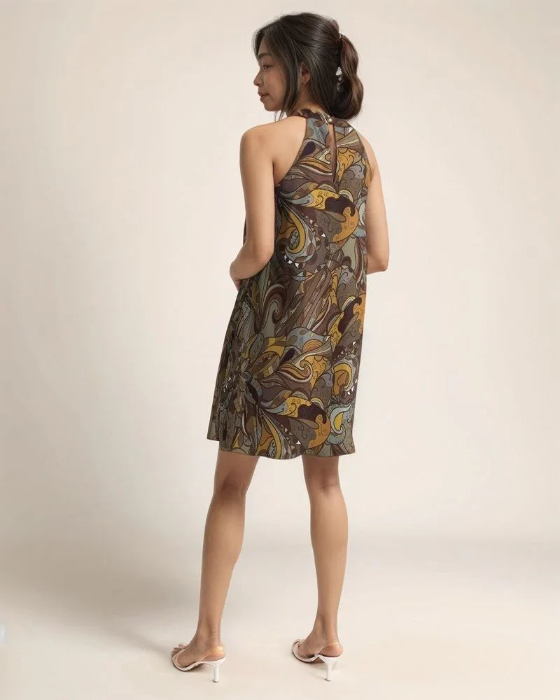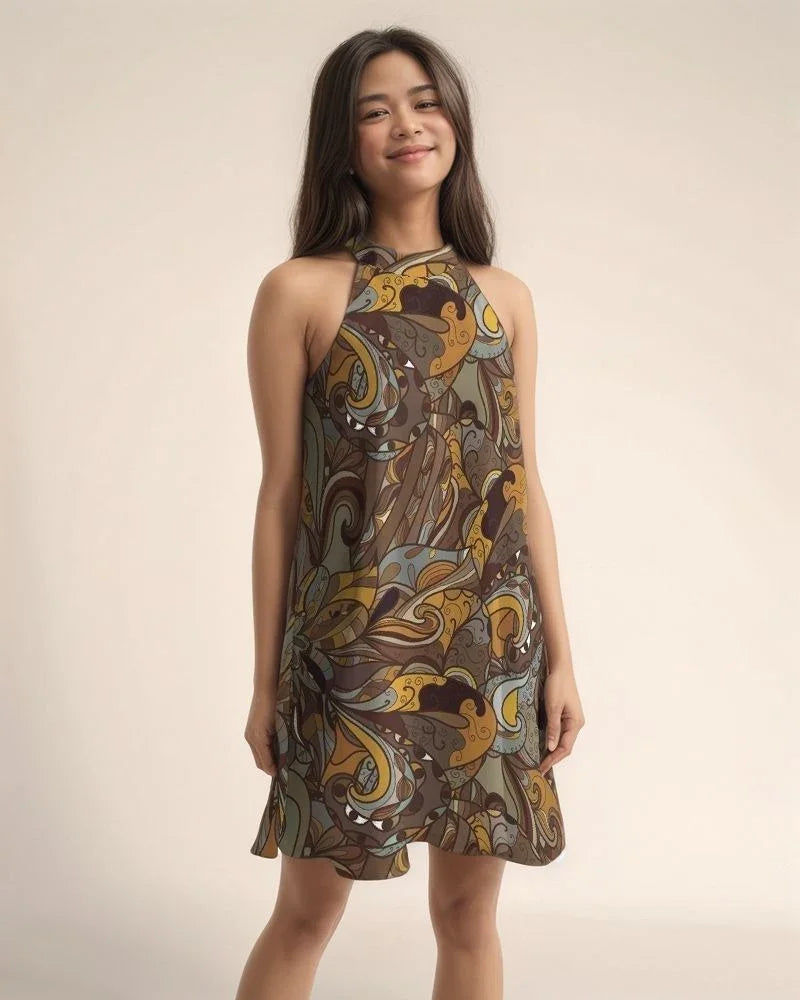 Ready to make a statement? The Ondas Halter Flare Dress is your ticket to effortless chic with a touch of vintage-inspired flair. This playful A-line dress features a captivating abstract print in rich, earthy tones of brown, gold, and muted blue, reminiscent of ocean waves and bohemian vibes.