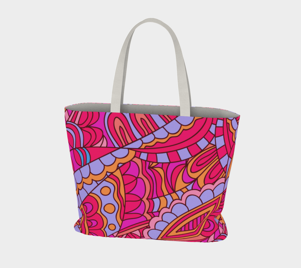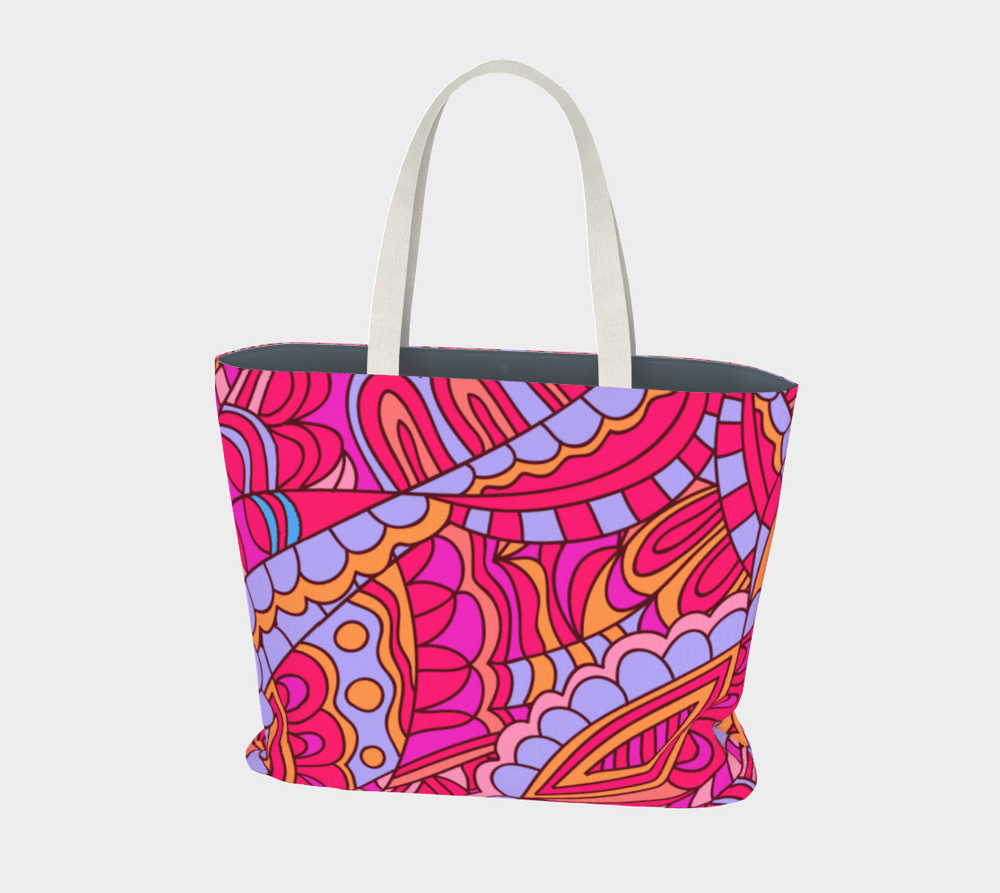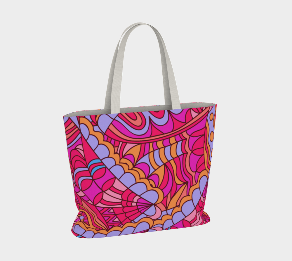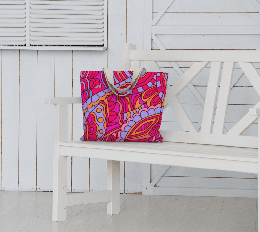 Brighten your day with the bold, beautiful Palai Large Market Tote Bag — the ultimate statement piece for fashionistas who live unapologetically in full color. Featuring an electrifying retro-inspired pattern with swirling fuchsias, fiery oranges, radiant purples, and pops of sophisticated yellow, this tote captures the free-spirited essence of 70s chic while exuding modern sophistication.