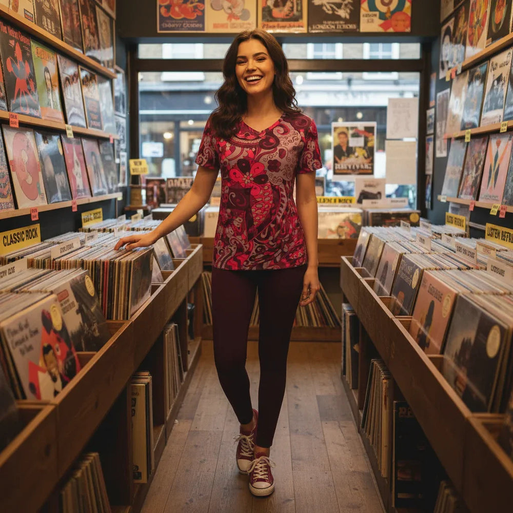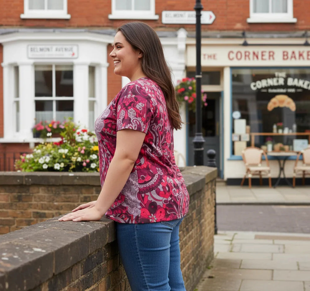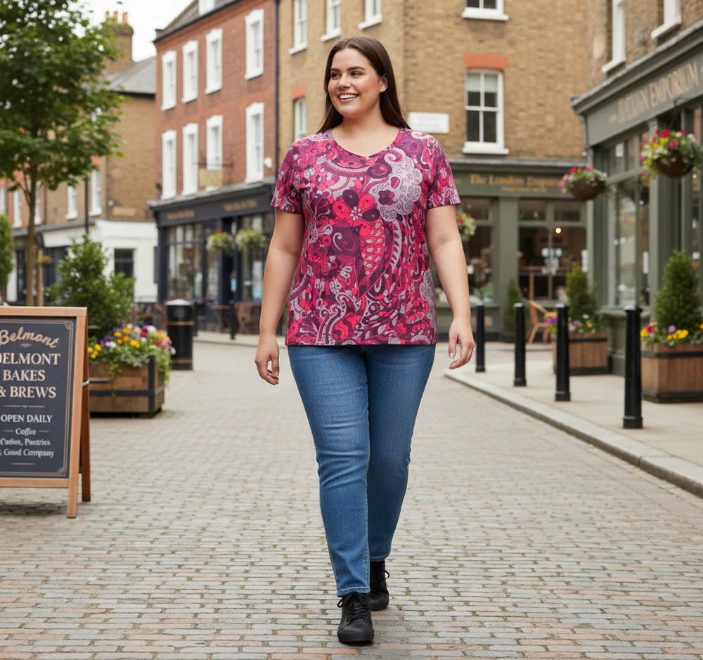 Elevate your everyday style with the mesmerizing Peña Patterned Print Tee – a burst of vibrant energy that turns heads and sparks conversations! Inspired by bold, psychedelic paisley motifs, this eye-catching women's t-shirt features swirling patterns in rich shades of fuchsia pink, deep plum purple, and fiery red, accented with intricate floral and abstract swirls for a retro yet modern vibe. Whether you're channeling bohemian chic or adding a pop of color to your casual wardrobe, this tee is designed to make you feel confident and effortlessly fashionable.