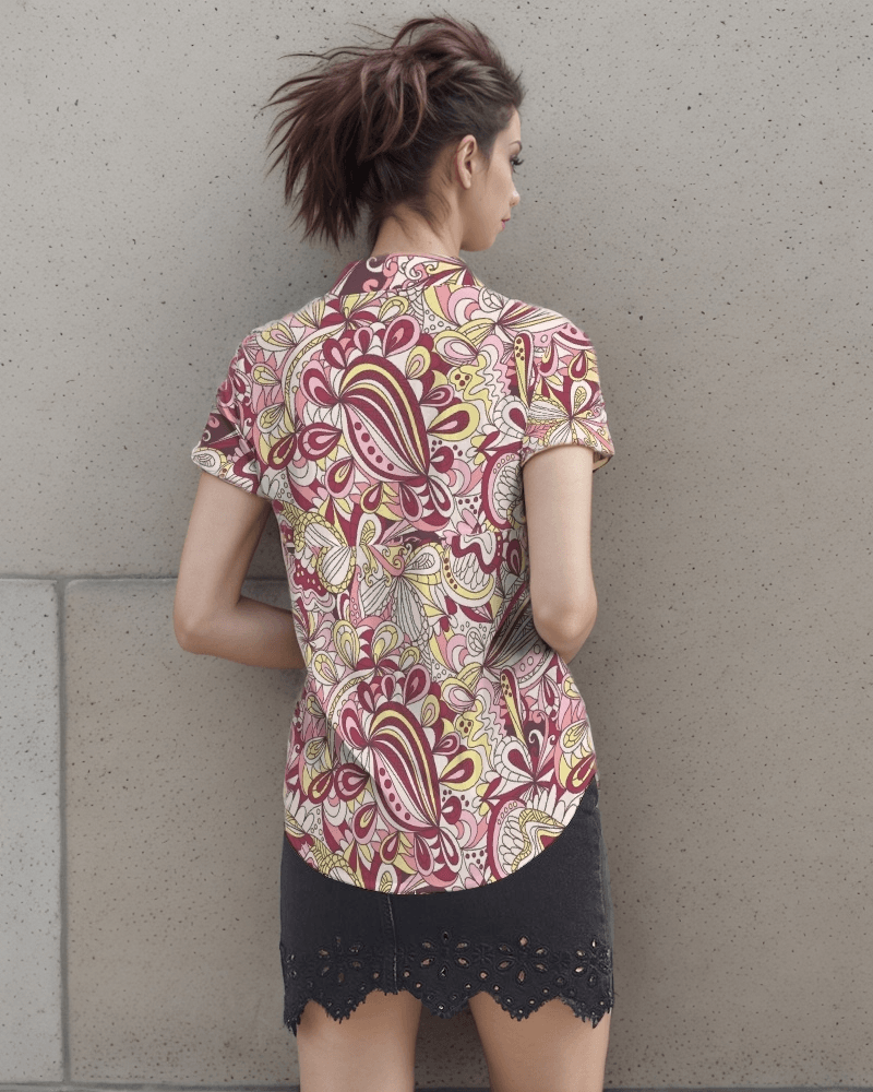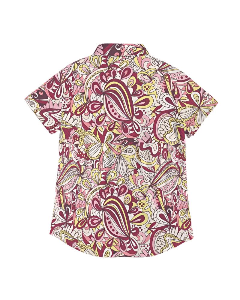 Make a bold artistic statement in this stunning retro-inspired button collar top. The show-stopping pattern features an intricate paisley and floral design in rich burgundy, soft yellow, and crisp white - creating a perfect harmony of vintage charm and modern sophistication. The short-sleeve silhouette paired with the classic collar offers versatile styling options, while the flowing fabric ensures all-day comfort.