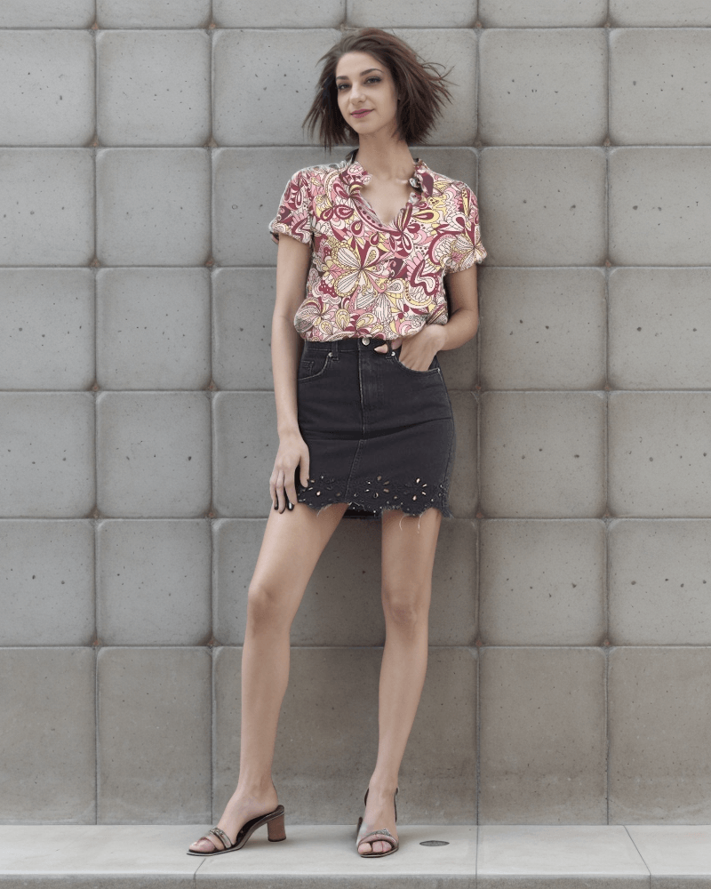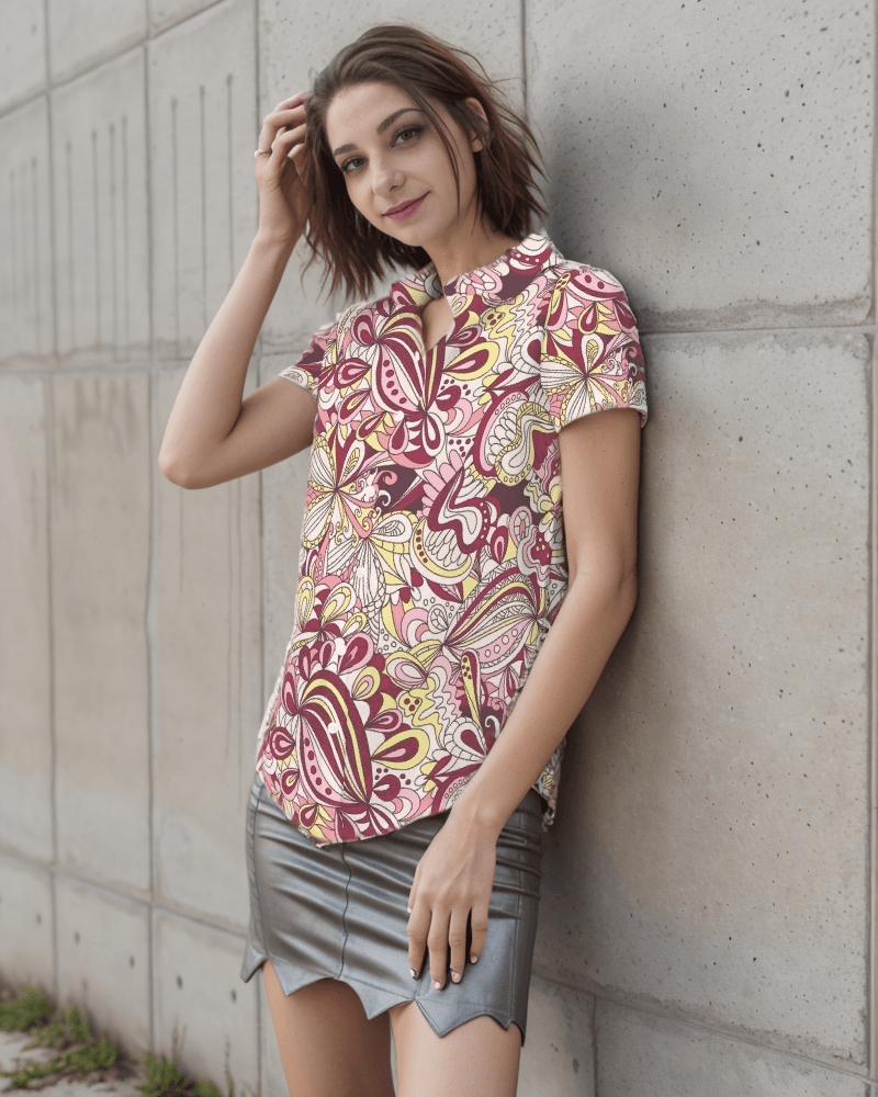 Perfect for the fashion-forward individual who isn't afraid to stand out, this top seamlessly blends artistic expression with wearable style. The refined collar adds structure to the free-flowing pattern, creating a balanced look that works from office to evening events.