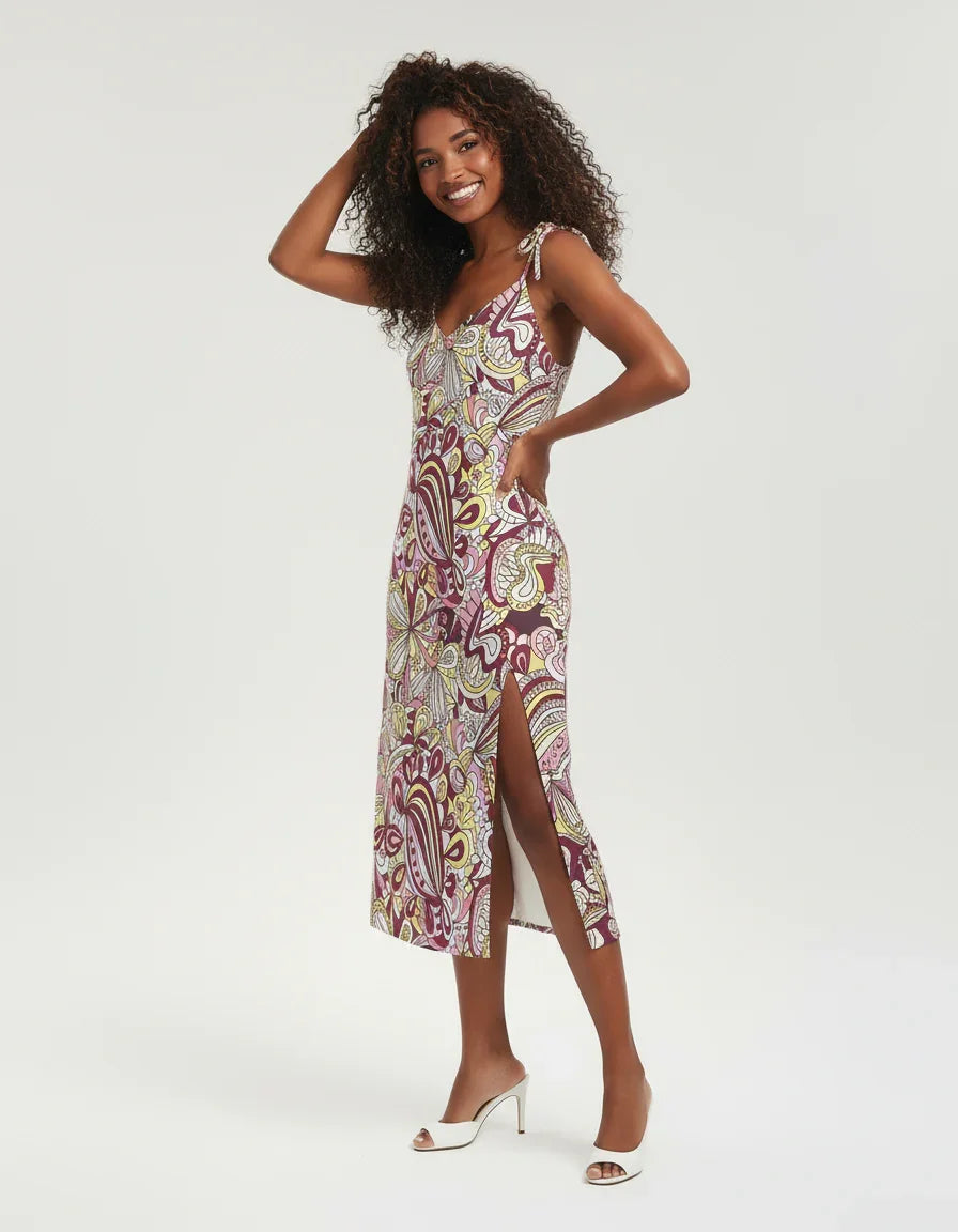 With delicate tie straps for adjustable comfort, a sultry side slit for a hint of allure, and a flattering V-neckline that accentuates your silhouette, this dress is designed to turn heads at summer brunches, beachside soirées, or casual date nights. Feel confident and radiant as the soft, breathable material moves with you, offering all-day comfort without sacrificing sophistication. Pair it with strappy heels for an elevated look or sandals for relaxed vibes—versatile, timeless, and utterly irresistible. Available in sizes XS to 2XL